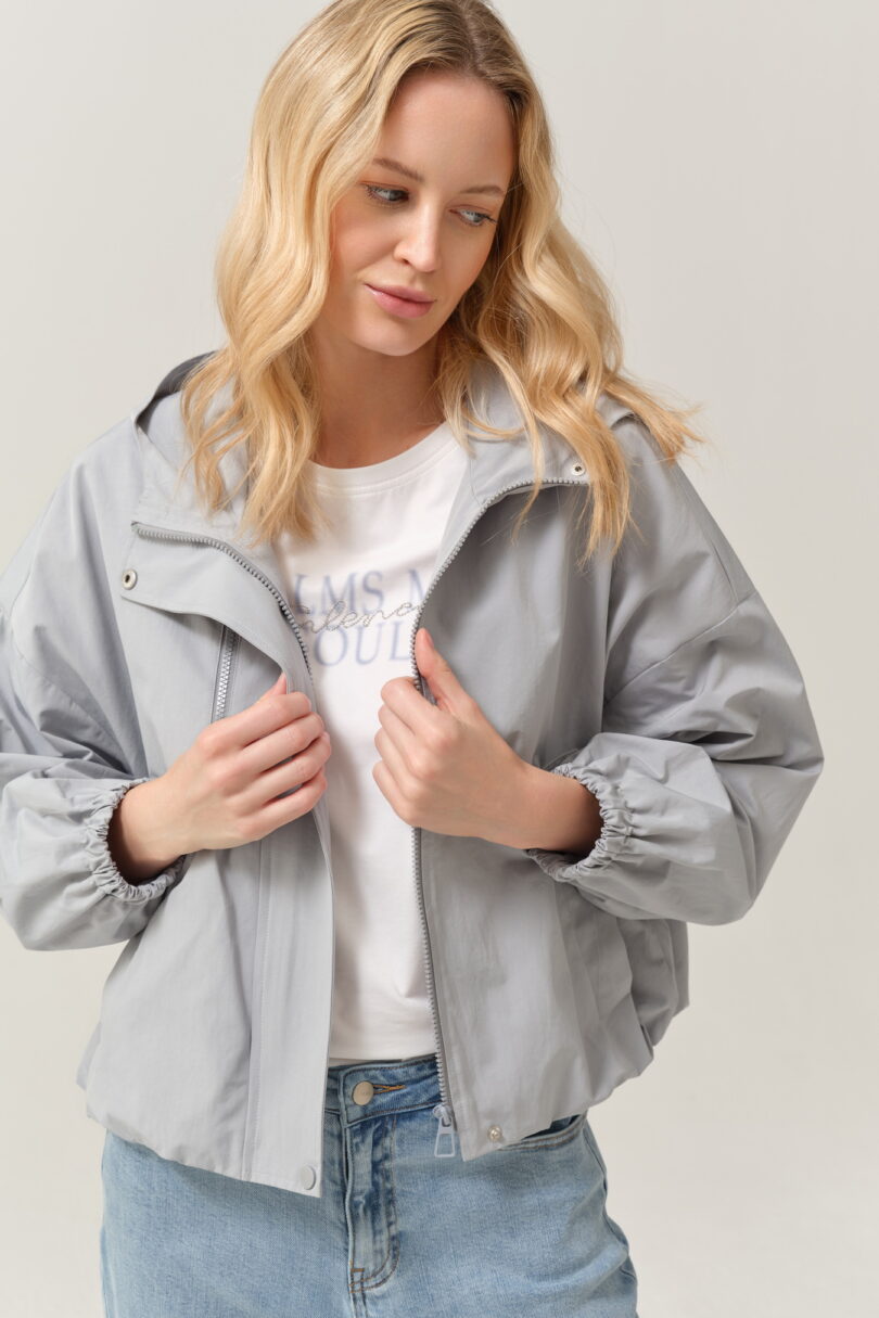 Nowoczesna, ultralekka kurtka w pięknym, pastelowym odcieniu błękitu. Wykonana z cienkiej, gładkiej tkaniny, idealnej na wiosnę i chłodniejsze letnie dni. Delikatnie oversize’owy krój zapewnia komfort i swobodę ruchów. Model posiada praktyczny kaptur z regulacją, zapięcie na zamek oraz dodatkową stójkę zapinaną na napę dla lepszej ochrony przed wiatrem. Z przodu znajdują się trzy funkcjonalne kieszenie — dwie boczne i jedna na piersi — wszystkie dyskretnie wkomponowane w projekt. Dół i rękawy wykończone są elastyczną gumką, co nadaje całości sportowego, nowoczesnego charakteru. Świetnie komponuje się z jeansami, bielą, szarościami i sportowym obuwiem. Idealna na codzienne spacery, podróże i casualowe stylizacje.