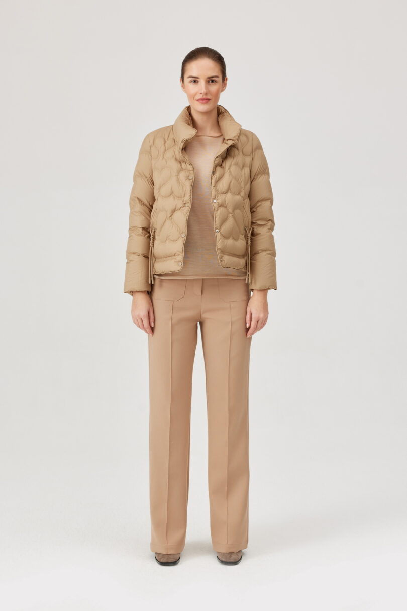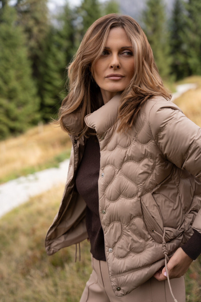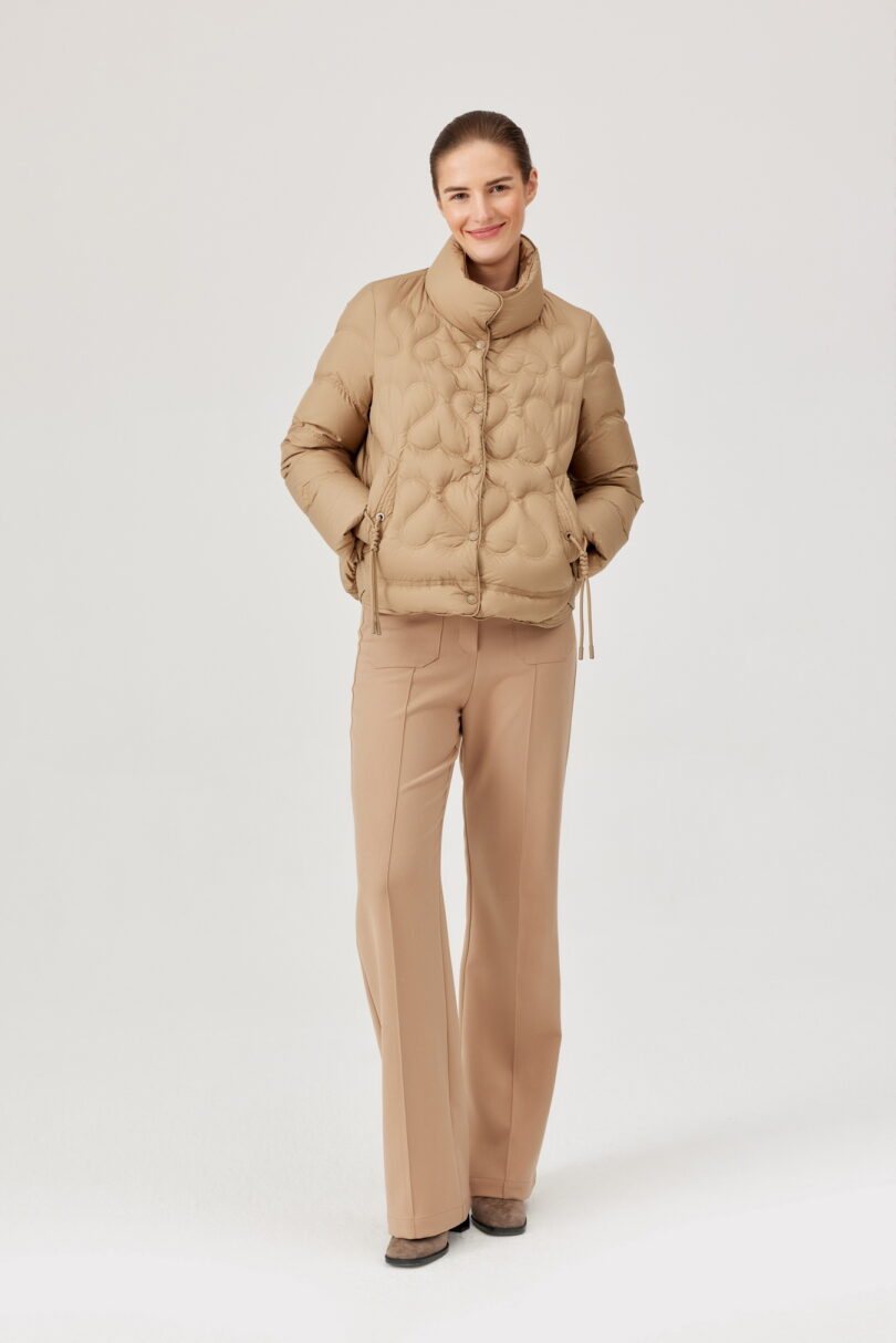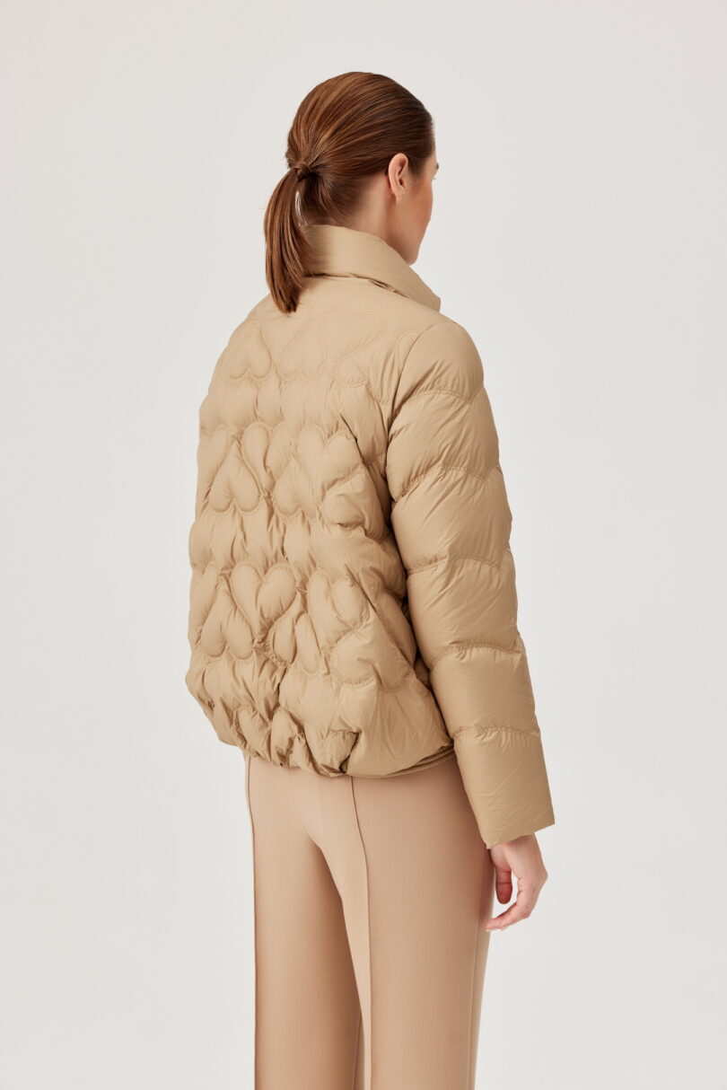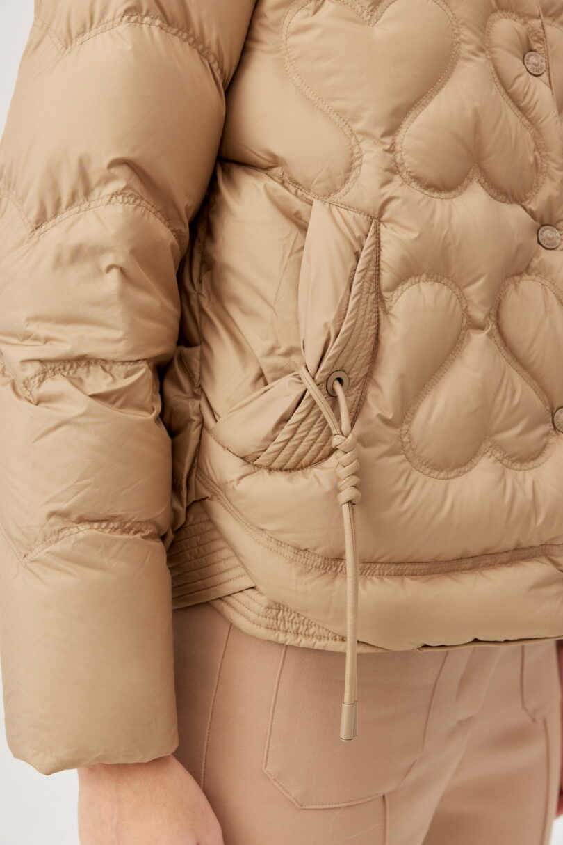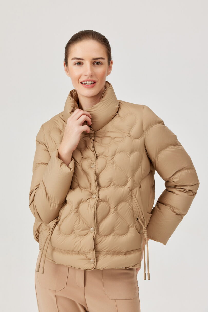 Krótka, jasno beżowa pikowana kurtka to idealna propozycja na chłodniejsze dni. Jej wyjątkowy charakter podkreśla oryginalne pikowanie w kształcie serc, które nadaje jej kobiecego uroku i subtelnej oryginalności. Kurtka zapinana jest na napy i posiada praktyczne kieszenie z dekoracyjnym ściągaczem i zamkami. Stójka chroni przed wiatrem, a miękka i lekka konstrukcja zapewnia komfort noszenia. Kurtka wypełniona naturalnym kaczym pierzem i puchem.
