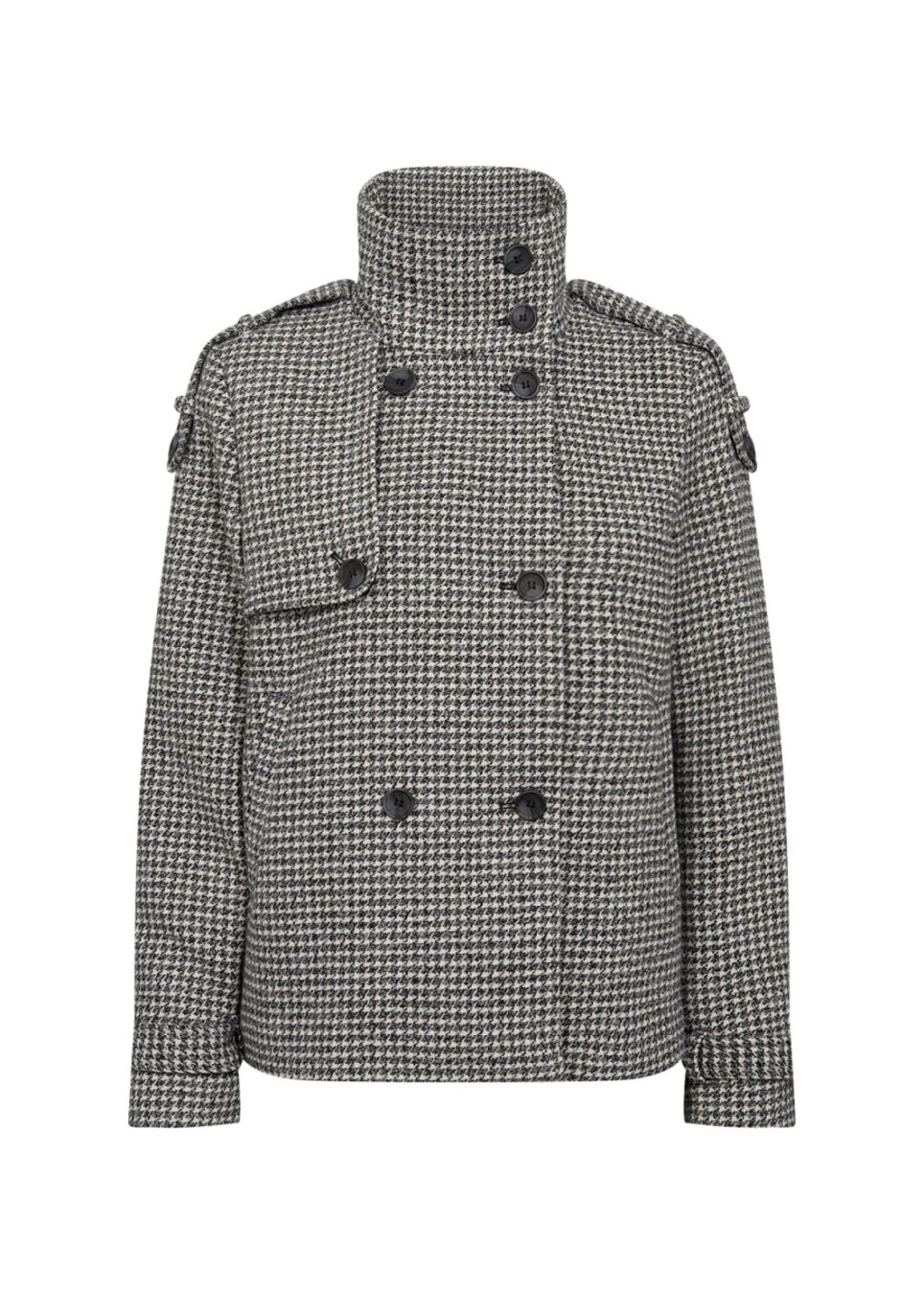 Wysoka stójka, kieszenie z klapką z przodu i dwurzędowe zapięcie na guziki z klapami na ramionach, nadają jej lekko sportowego wyglądu.