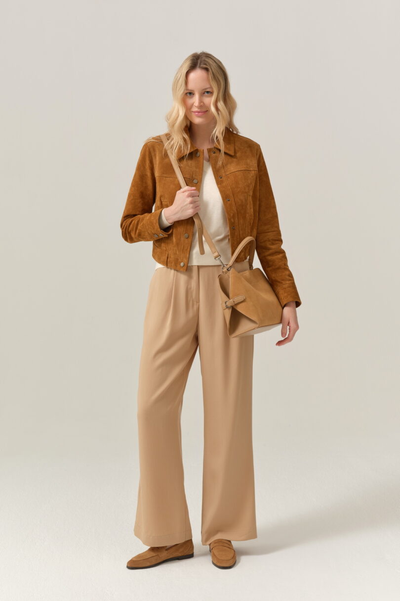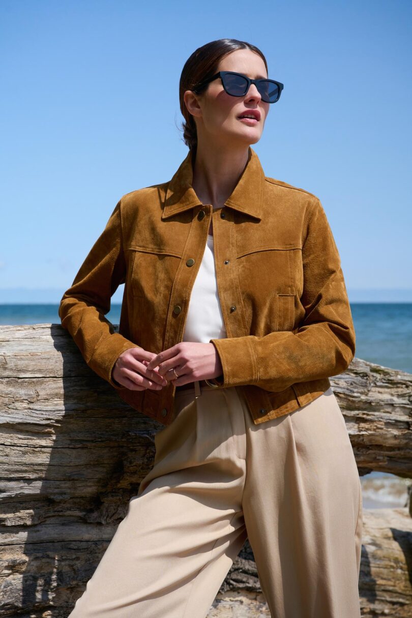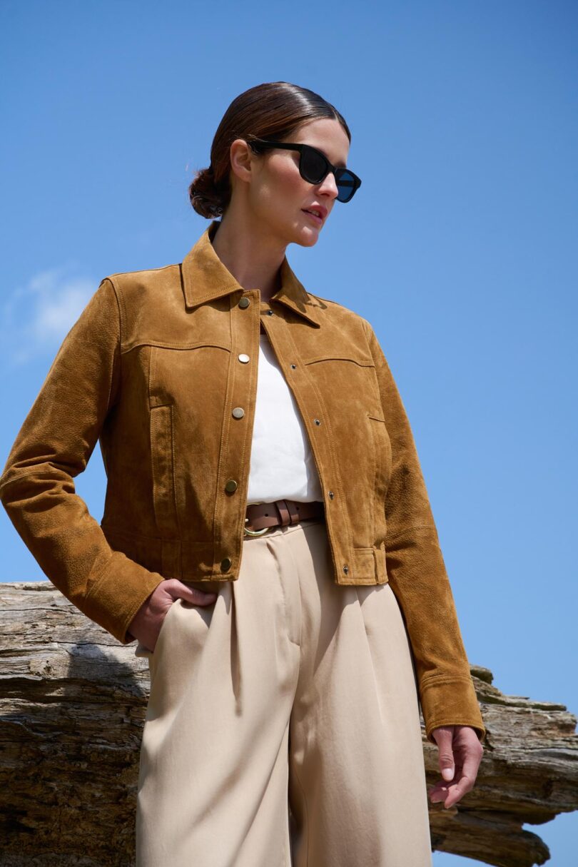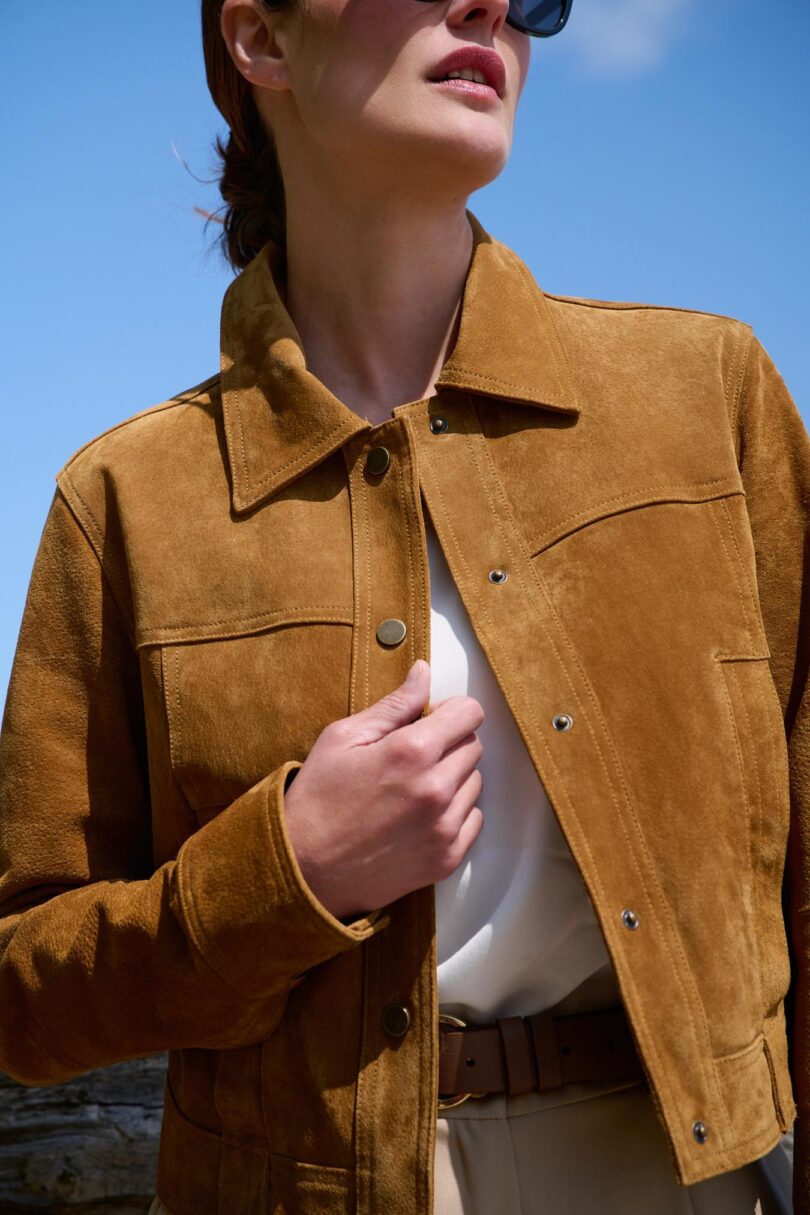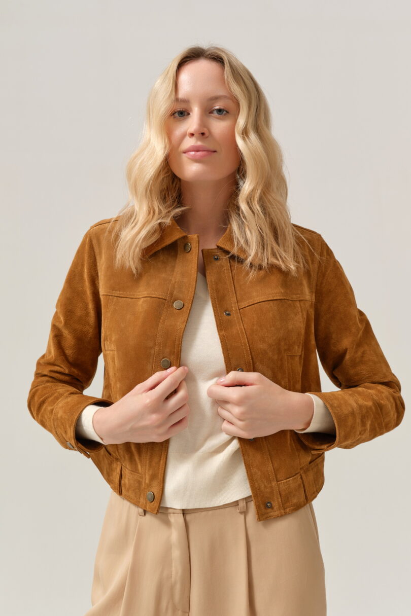 Stylowa kurtka FÉRIA wykonana z naturalnego zamszu w ciepłym, brązowym odcieniu to propozycja dla kobiet ceniących ponadczasową elegancję z nutą stylu vintage.