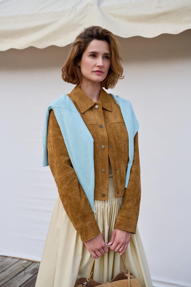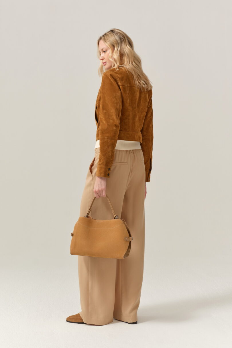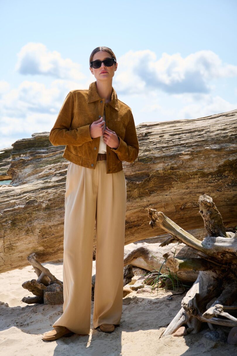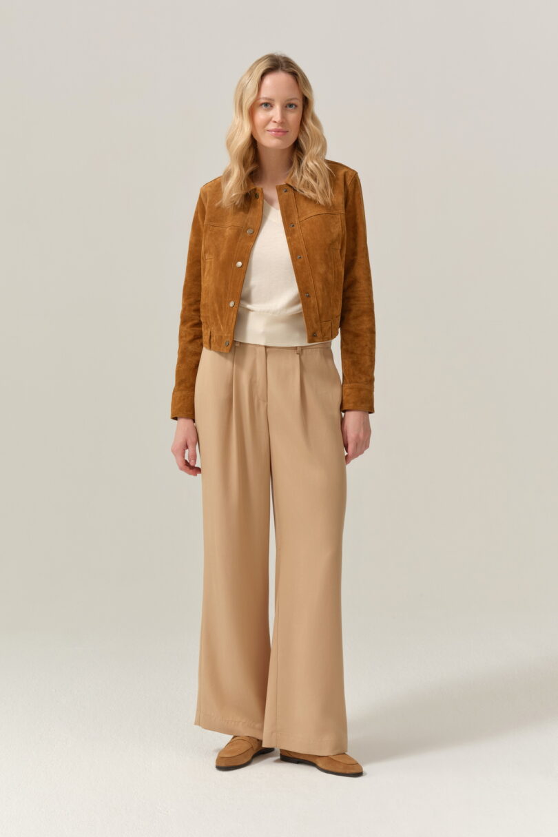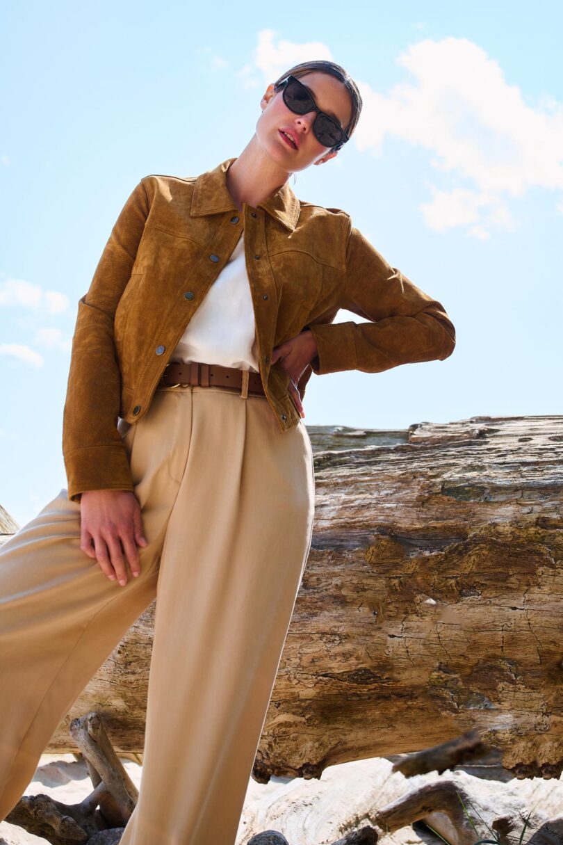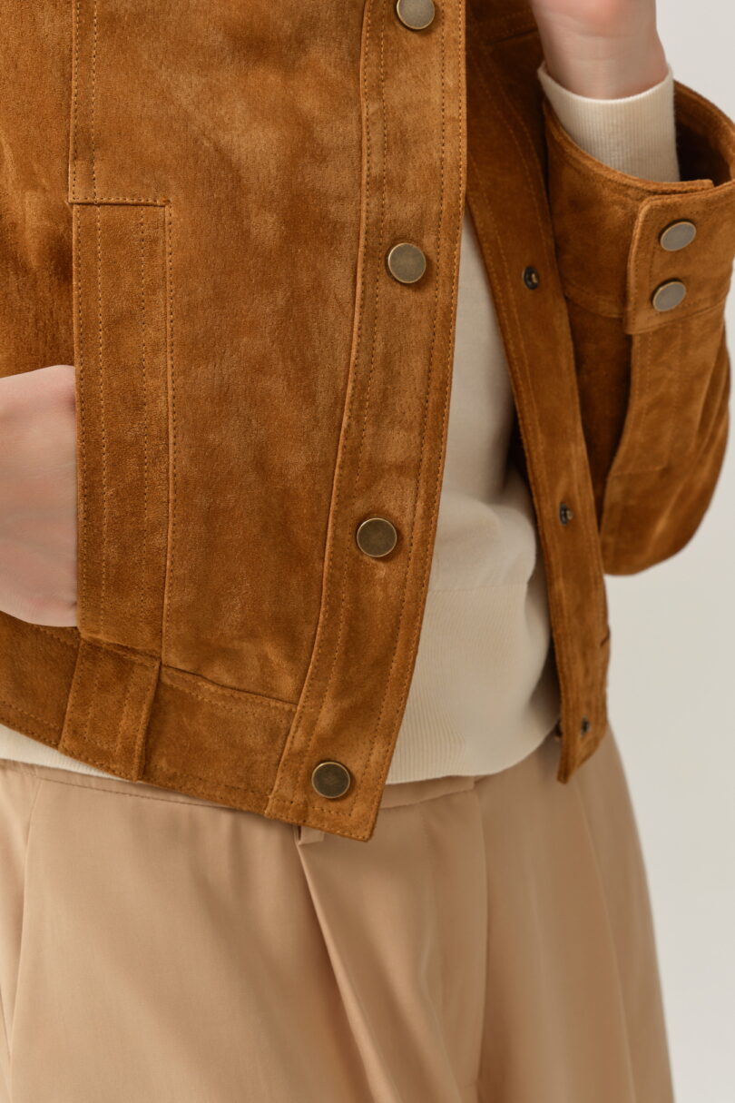Stylowa kurtka FÉRIA wykonana z naturalnego zamszu w ciepłym, brązowym odcieniu to propozycja dla kobiet ceniących ponadczasową elegancję z nutą stylu vintage.