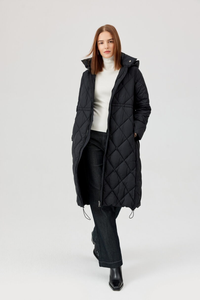 Czarny pikowany płaszcz FÉRIA z kapturem.