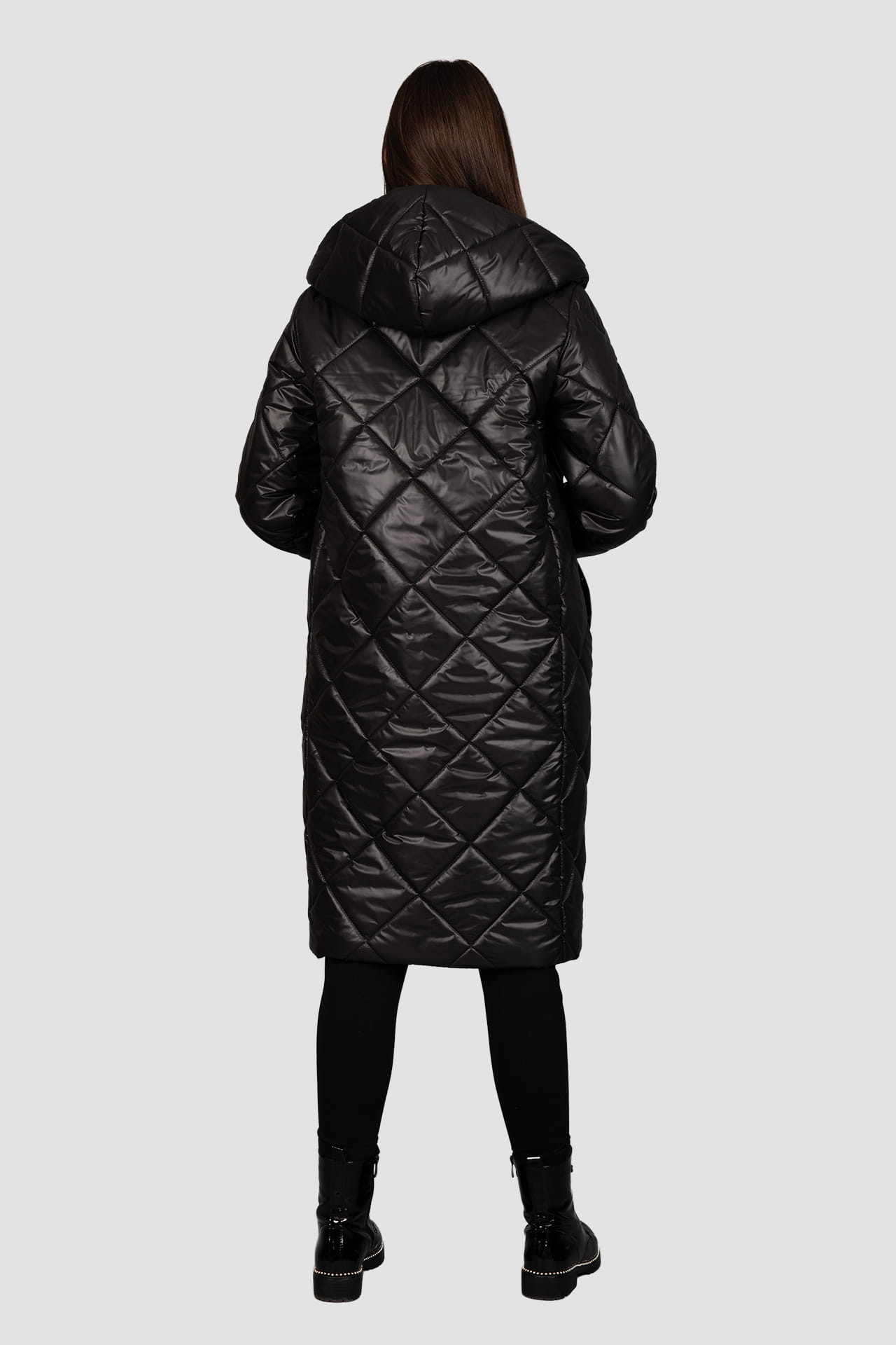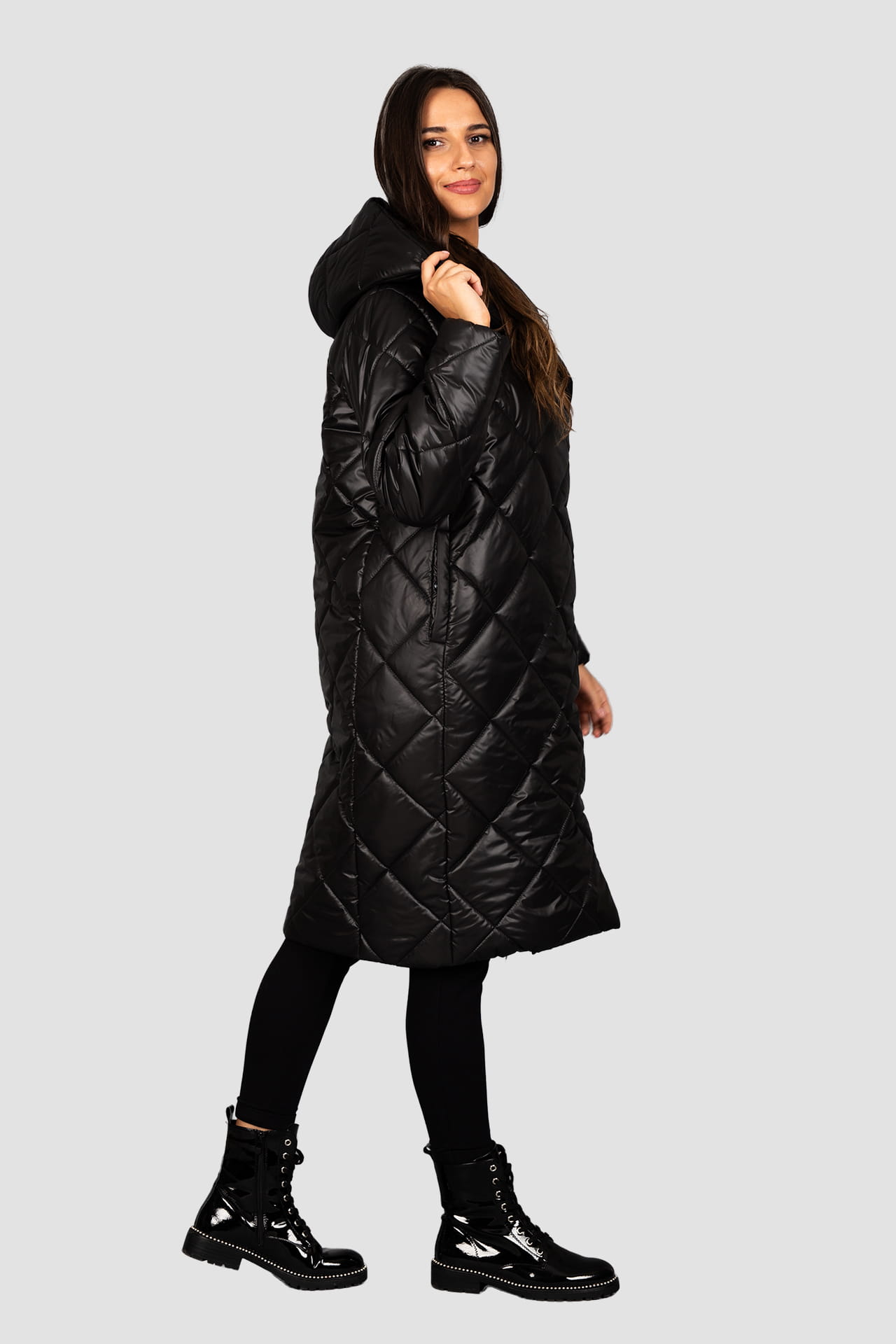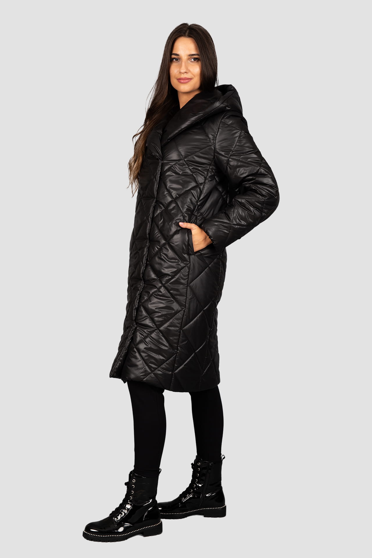Czarny płaszcz , ocieplany wysokiej jakości wypełnieniem, pikowany we wzór karo. Zapinany na napy, z dużym kapturem. Bardzo lekki, a przy tym bardzo ciepły. Uszyty w Polsce. Czas wysyłki 1-2 dni.