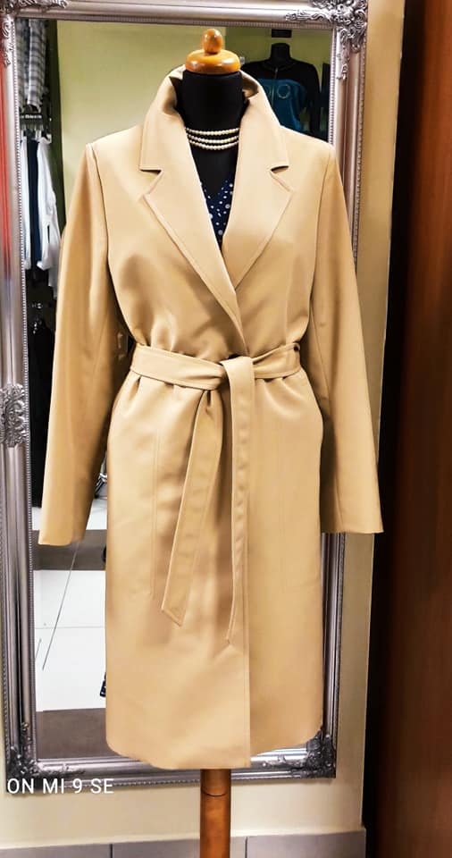 Płaszcz zapinany jest dwurzedowo na guziki w talii, dodatkowo do płaszcza dołączony jest pasek. Poza tradycyjnym wiązaniem polecamy delikatnie zawiązać pasek na plecach gdy płaszcz jest rozpięty. Kieszenie w wąskiej ramce obszyte są stebnówką imitującą duże, nakładane kieszenie.