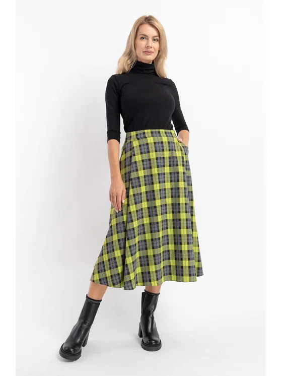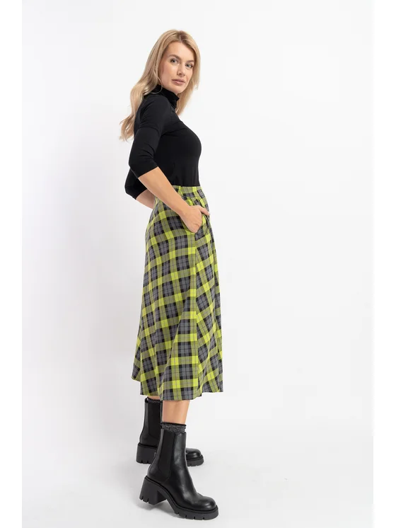 Spódnica Waja Green ma ponadczasowy print w kratę. Zielony – dominujący kolor przeplata się z szarym, razem tworzą świetne połączenie. Dobrej jakości materiał – krojony ręcznie sprawi, że poczujesz się – jakby spódnica była szyta na Twoje zamówienie. Dyskretne kieszenie po bokach na pewno zostaną przez Ciebie wykorzystane.