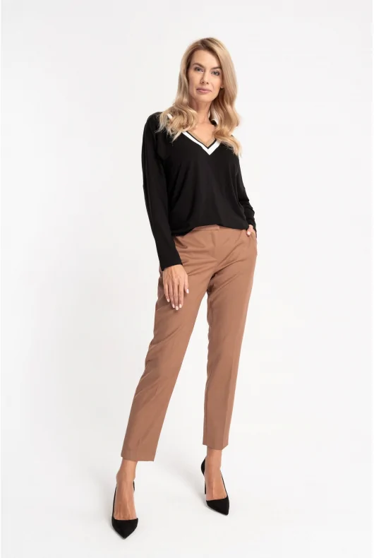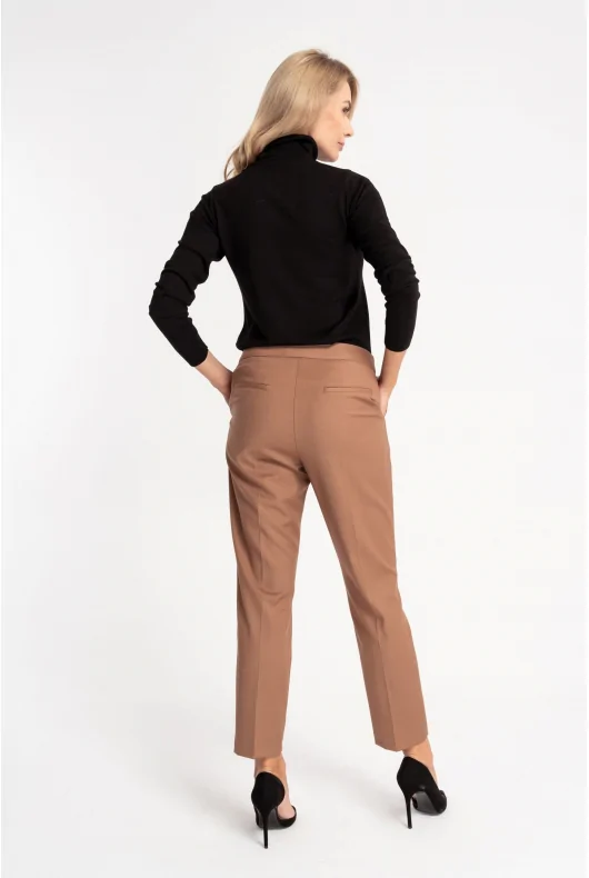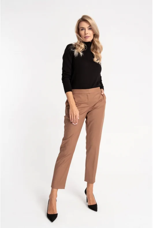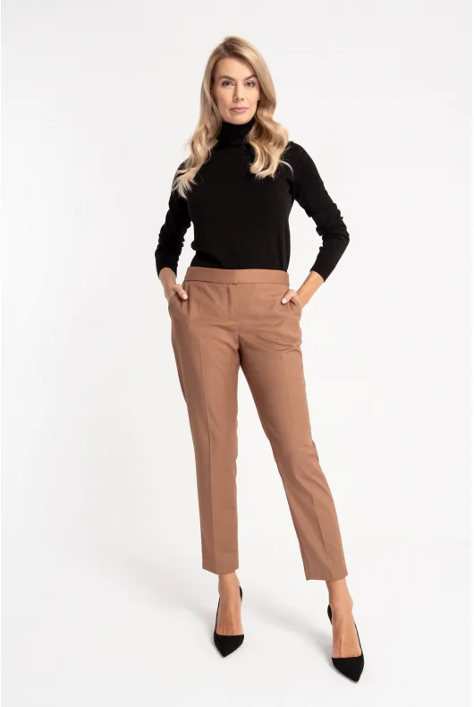 Tkaninowe spodnie lekko zwężane na dole. Zapinane na suwak, guzik i haftkę ukryte pod listwą. Po bokach skośno wszyte kieszenie. Z tyłu dwie listewki imitujące kieszonki. Nogawki zaprasowane w kant dodają klasycznej elegancji. Długość przed kostkę.