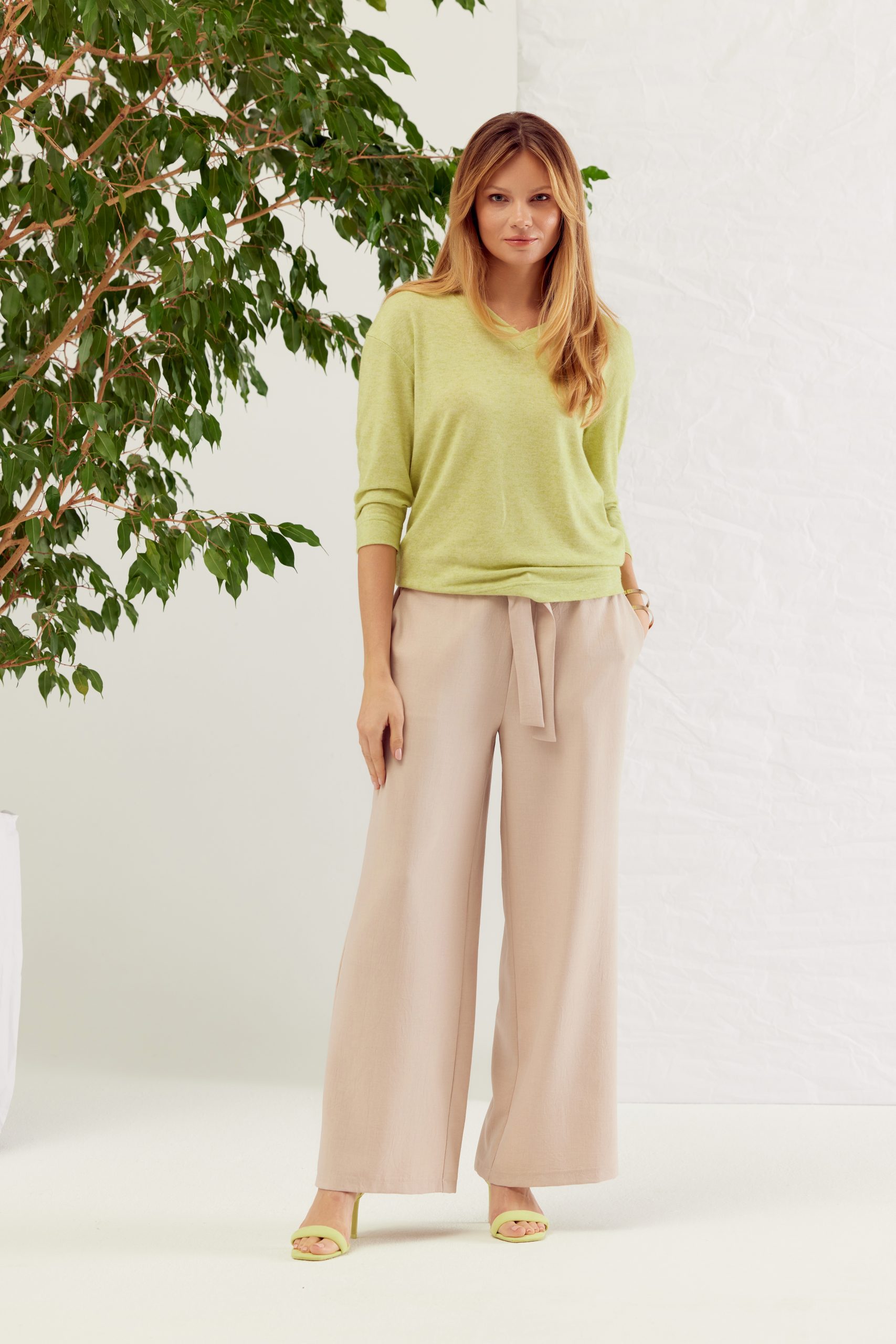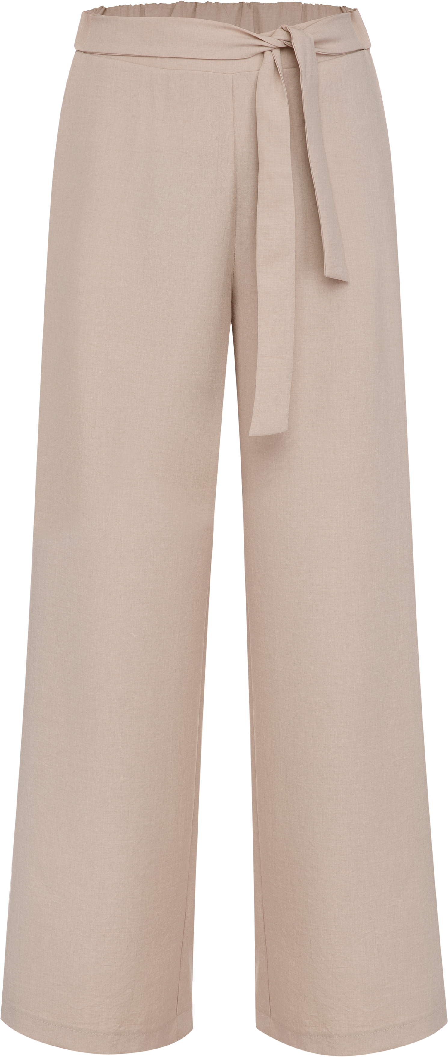 Beżowe spodnie z szerokimi nogawkami z gumą w talii. Po bokach dwie kieszenie. Uszyte z cienkiej tkaniny a’la len. Bardzo lekkie i komfortowe, idealne nawet na duże temperatury.