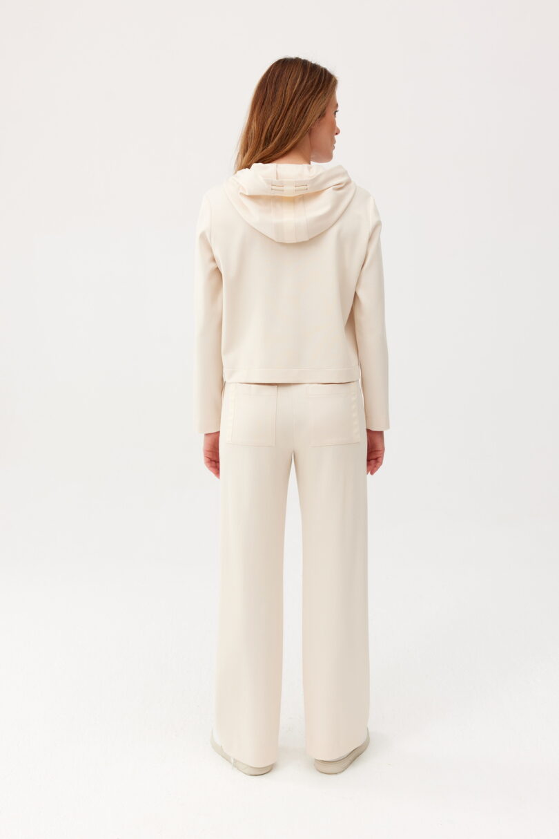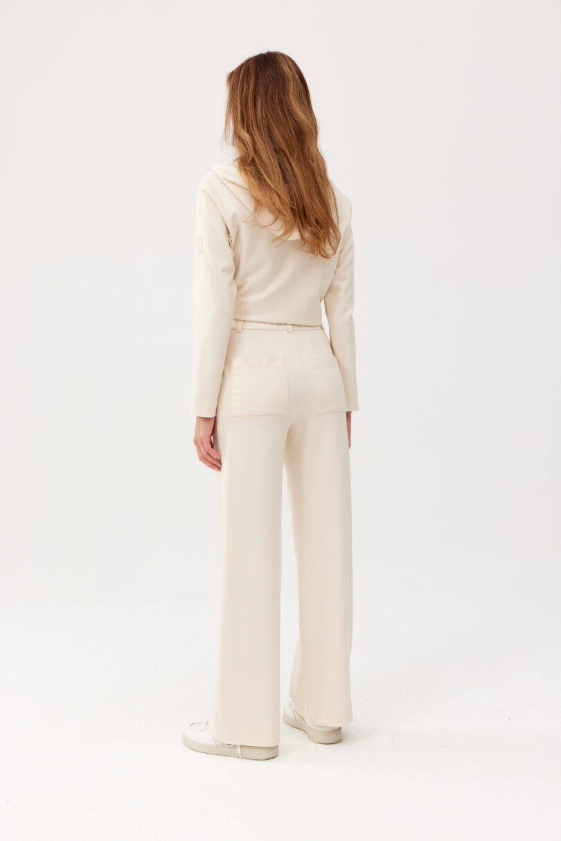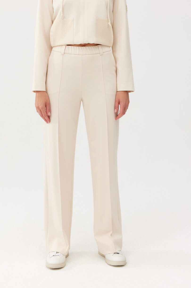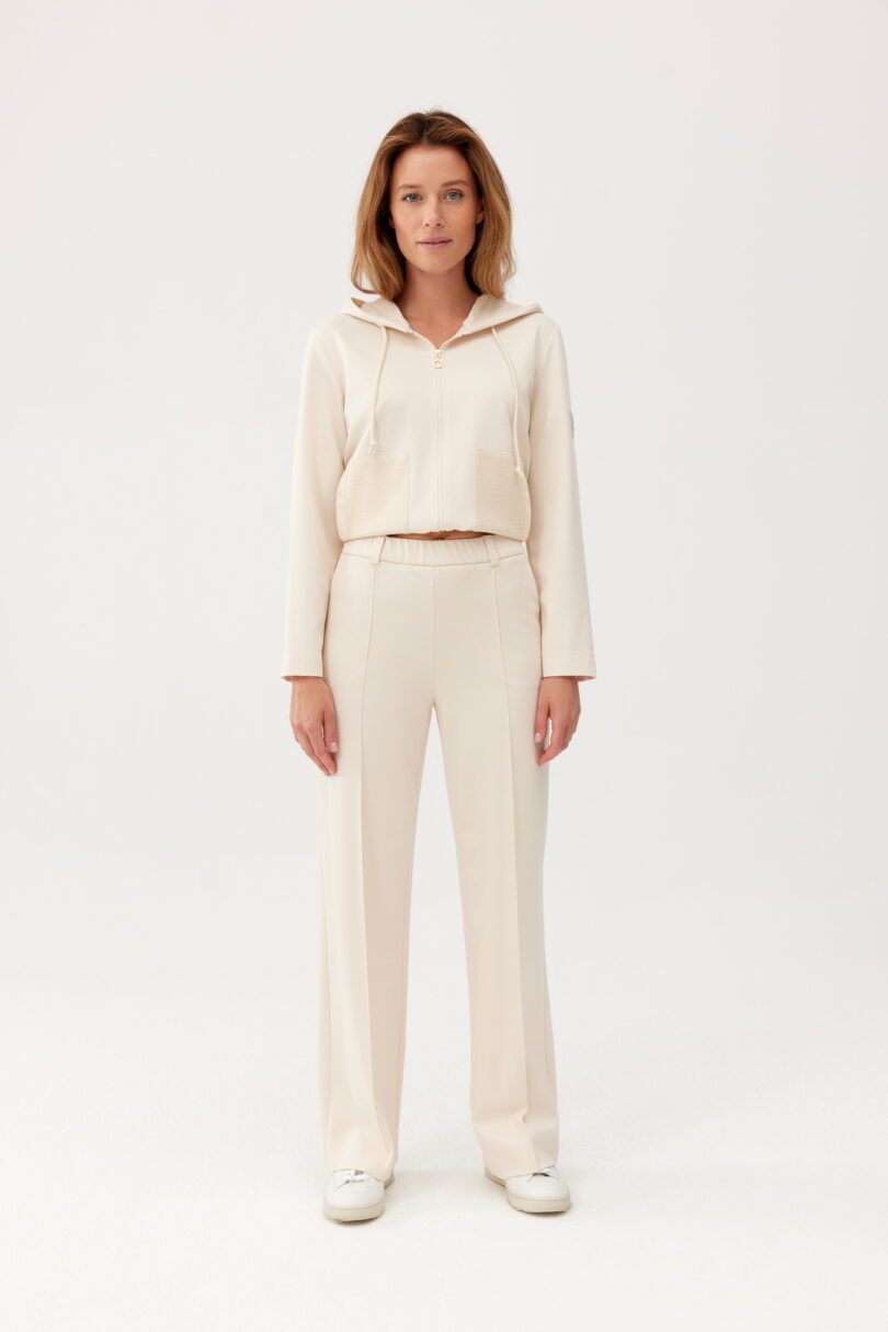 Casualowo-sportowe spodnie FERIA z szeroką nogawką. Wykonane z mięsistej dzianiny. W szwach bocznych kieszenie. W tali ułatwiająca dopasowanie do sylwetki gumka. W zestawieniu z bluzą z kolekcji FERIA tworzy niezwykle efektowną sportową stylizacje.