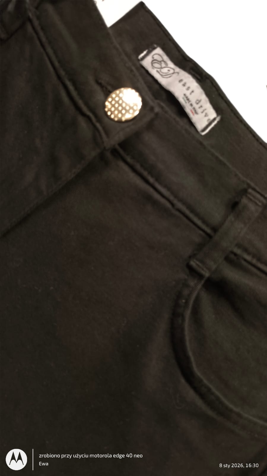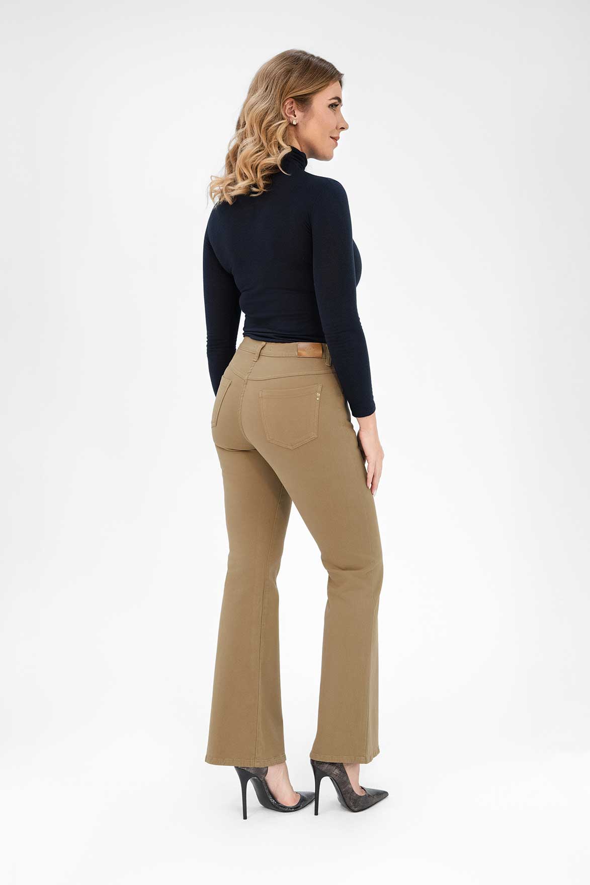 Spodnie mają 5 kieszeni, lekko dzwonkowatą nogawkę, która pięknie wydłuża nogi. Elastyczny pasek ze szlufkami. Wysoki stan sprawia, że są bardzo wygodne i przy pochylaniu, lub siadaniu świetnie trzymają się talii.