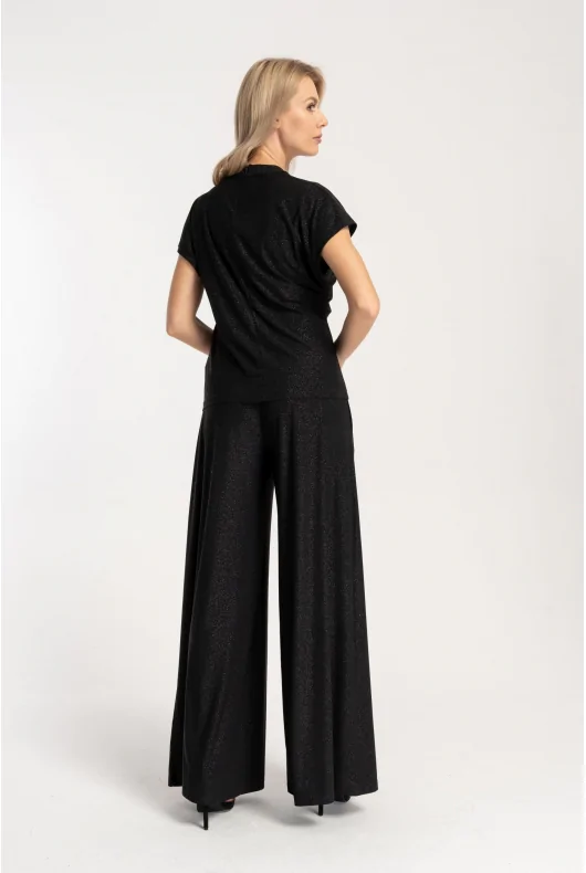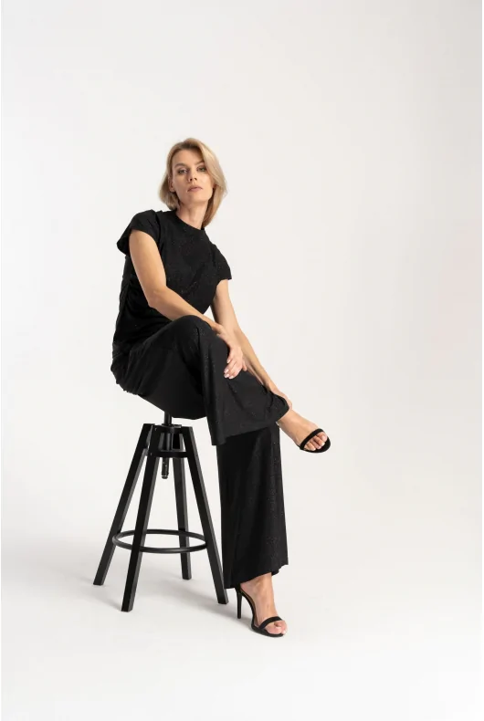 Czarne spodnie z brokatem o luźnym, swobodnym kroju. Wykonane z cienkiej dzianiny. W pasie wszyta szeroka gumka. Po bokach dwie wsuwane kieszenie. Nogawki rozszerzają się ku dołowi.