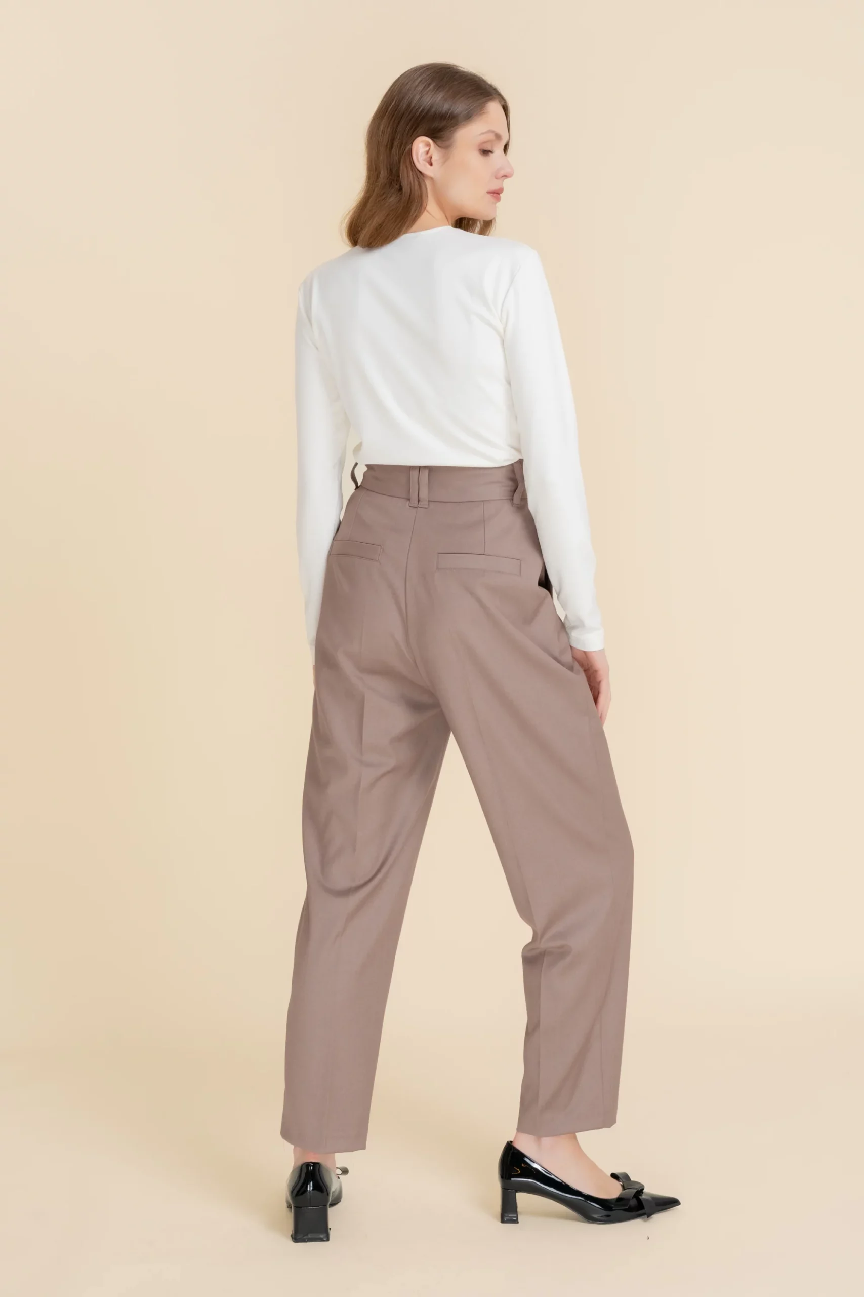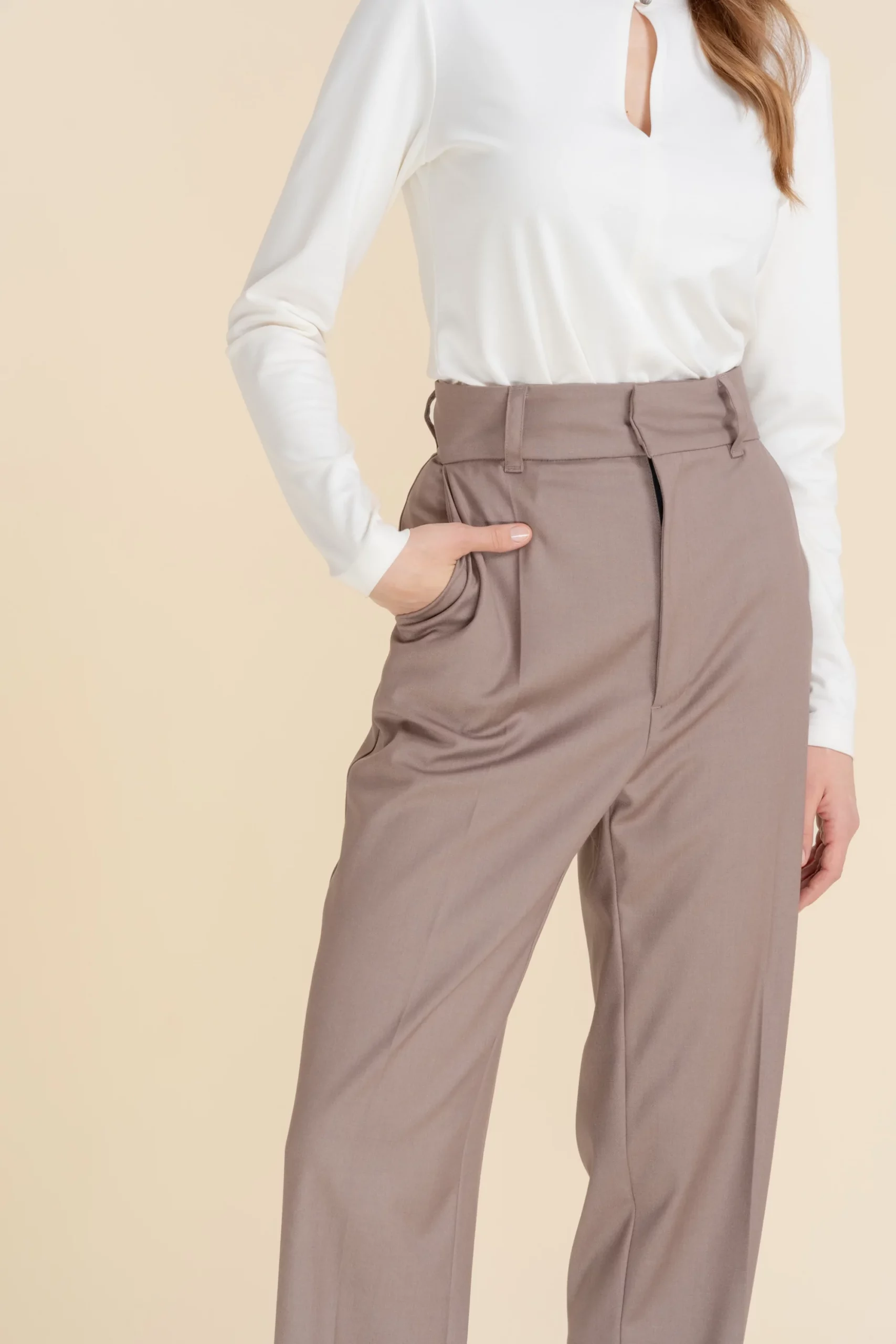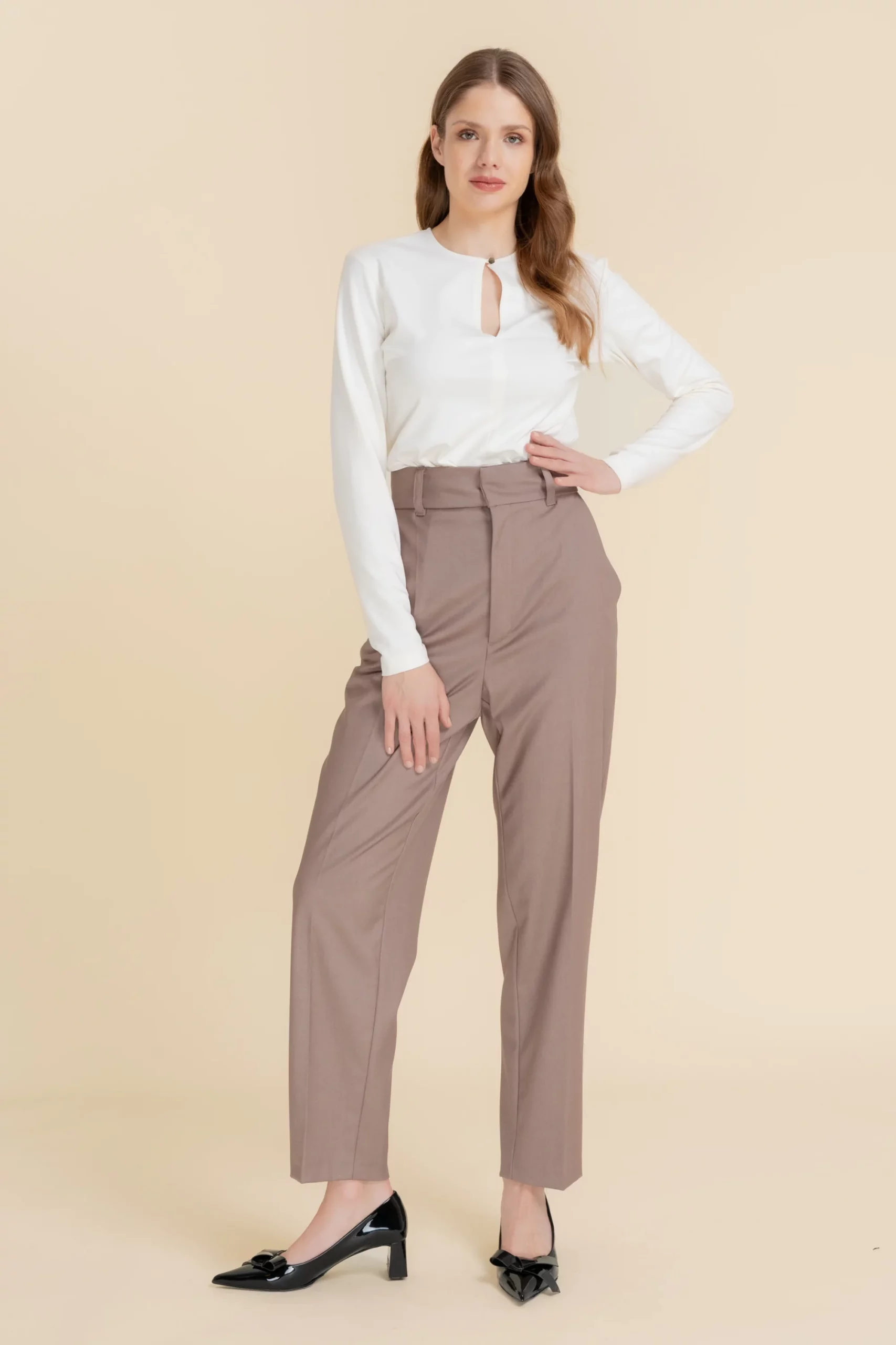 Prosta nogawka lekko zwężająca się ku dołowi. Zapinane na suwak, haftki i guzik ukryte pod listwą. Z przodu dwie kieszenie. Z tyłu listwy imitujące kieszonki. W pasie szlufki na pasek.