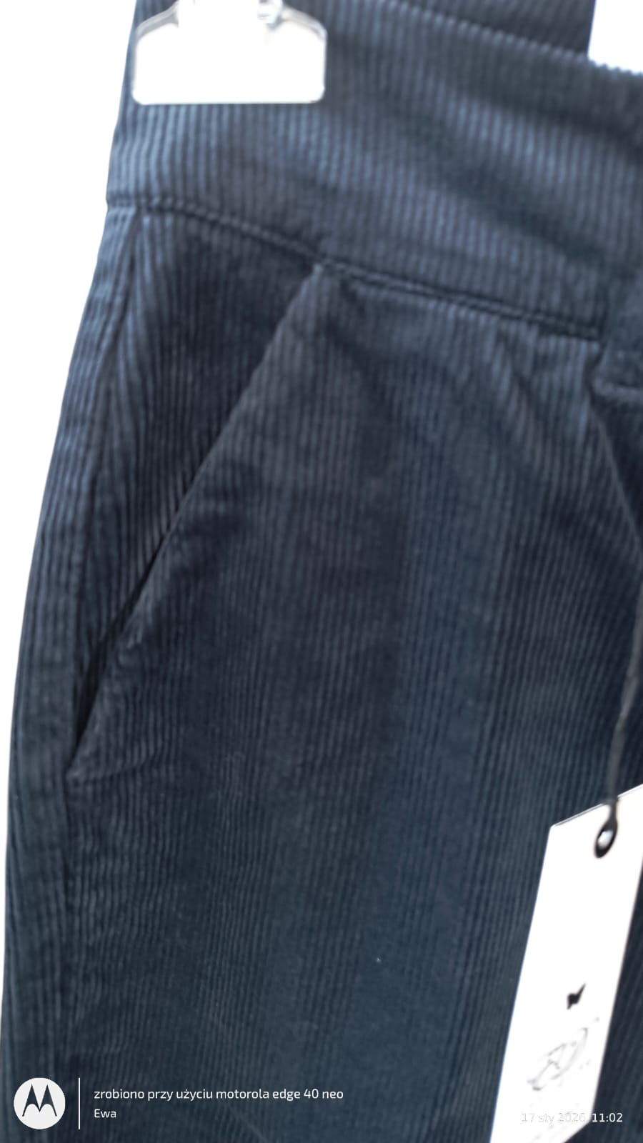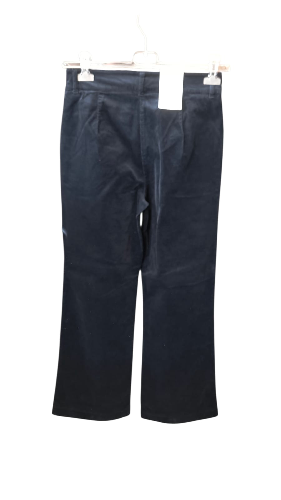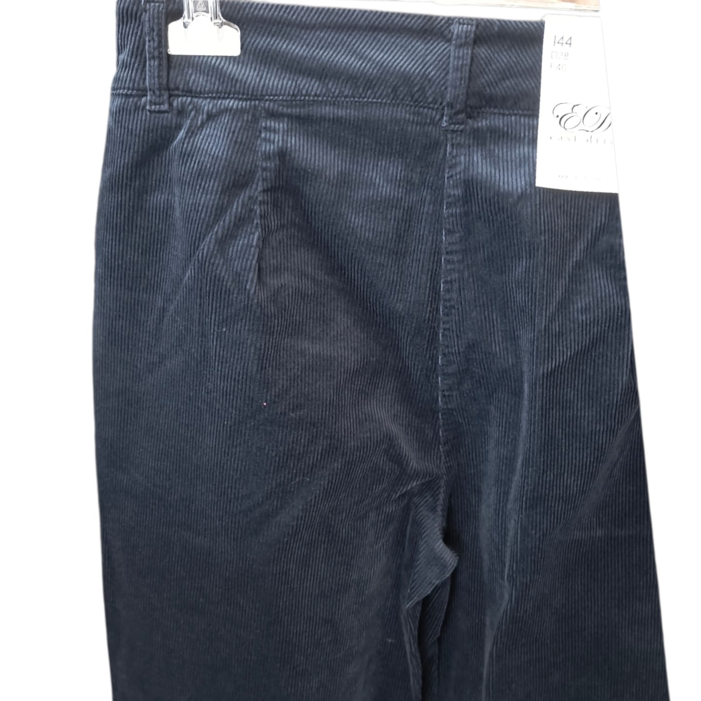 Spodnie z bawełnianego sztruksu. Wysoki stan, rozporek na suwak i guzik.