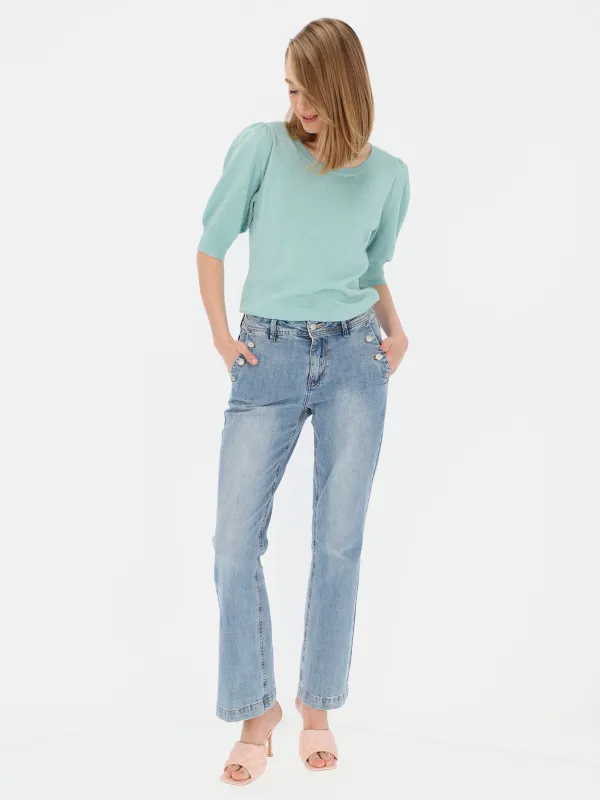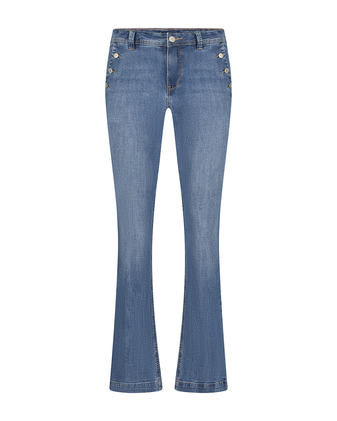 Spodnie mają wysoki stan, zapięcie na dwa guziki i kieszenie boczne. Bibette ecru & buttons mają dopasowany krój w udach i biodrach, rozszerzają się od kolan, idealnie modelując i wydłużając nogi.