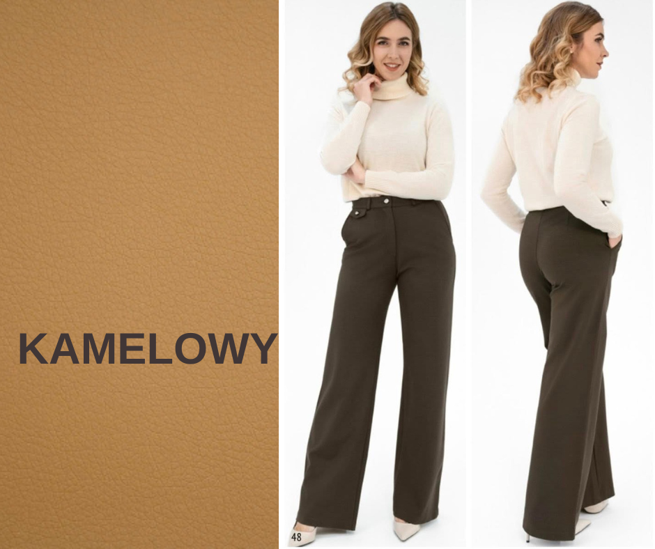 Kamelowe  spodnie z wysokim stanem szyte z elastycznej, mięsistej wiskozy typu punto. Są bardzo wygodne i elastyczne. Proste, lekko profilowane w kolanach nogawki wysmuklają sylwetkę  i wydłużają nogi. Uszyte we Włoszech.