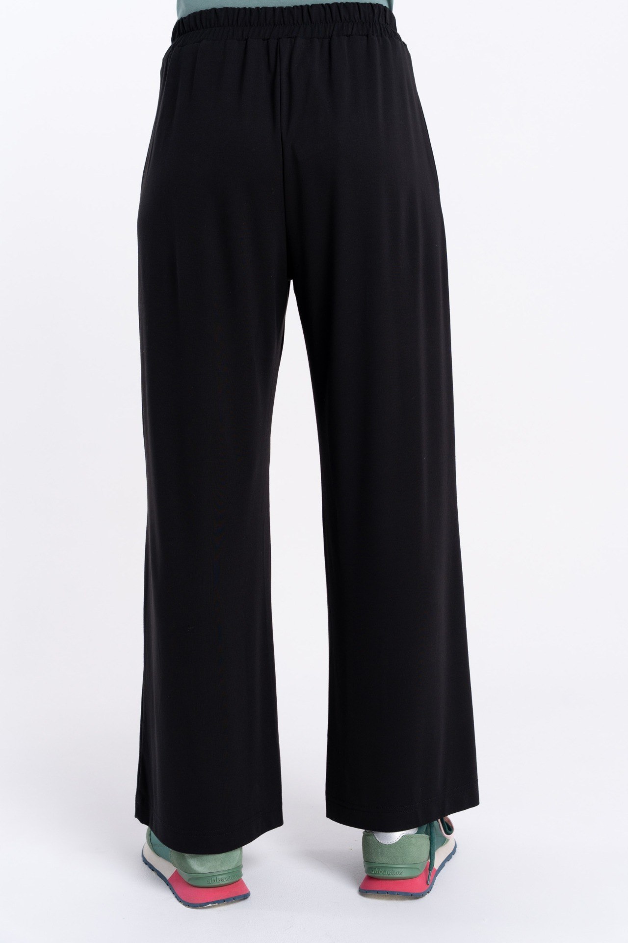 Szerokie, czarne spodnie z lejącej, wiskozowej tkaniny.