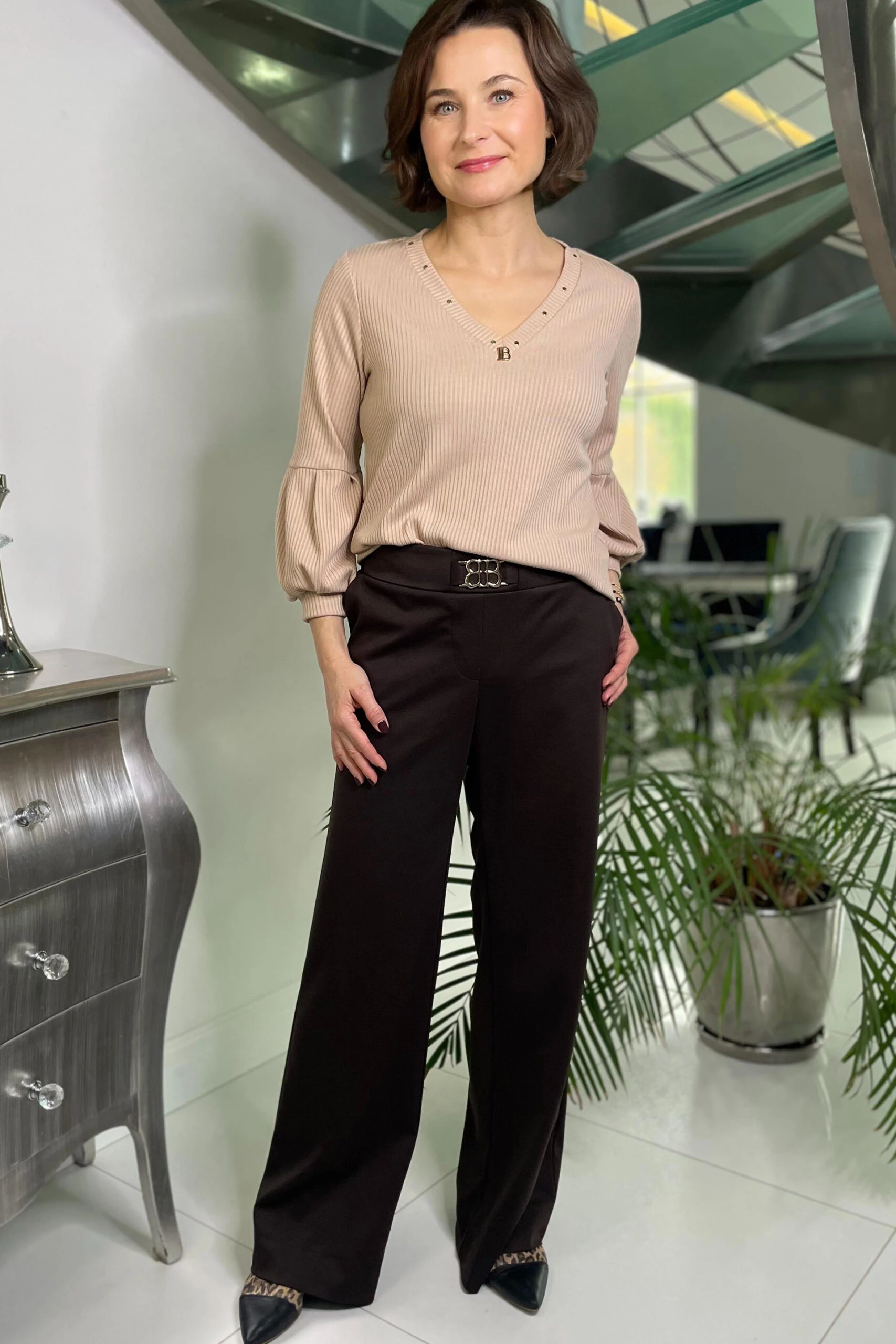 Czekoladowe, dzianinowe spodnie z ozdobną klamrą na przodzie. Świetny, sprawdzony model, cudownie wyszczuplają sylwetkę. Uszyte w Polsce. Czas wysyłki 1-2 dni.