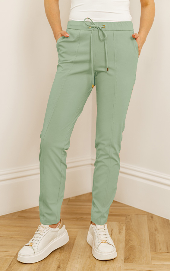 Dzianinowe spodnie damskie Fang w kolorze jeansowym uszyte są z miękkiej i elastycznej dzianiny z delikatnym połyskiem. Nogawki posiadają pionowe przeszycia, które optycznie wysmuklają nogi i „wyciągają” sylwetkę. Po bokach znajdują się dwie kieszenie wewnętrzne. W pasie wszyta jest niewidoczna guma, dzięki której spodnie idealnie dopasują się do figury, a Ty będziesz czuła się w nich swobodnie i komfortowo przez cały dzień. Spodnie są dodatkowo regulowane w talii za pomocą sznureczka z ozdobnymi srebrnymi zakończeniami.