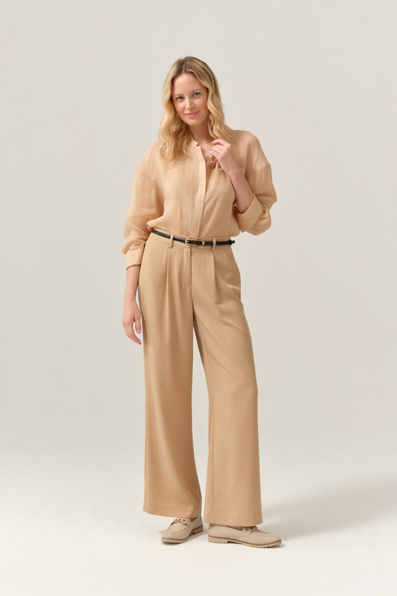 Eleganckie, lekkie spodnie o prostym, delikatnie zwiewnym kroju. Wykonane z gładkiej tkaniny, która miękko opada i pięknie pracuje w ruchu. W talii wszyta jest elastyczna gumka z tyłu, dzięki czemu spodnie doskonale dopasowują się do sylwetki i zapewniają wysoki komfort noszenia. Z przodu klasyczne zapięcie na guzik i zamek, subtelne zakładki oraz szlufki, co pozwala nosić je również z paskiem. Długość pełna, nogawka prosta i lekko luźna — idealna do stylizacji eleganckich i smart casual. Świetnie prezentują się w total looku z beżem, bielą lub czernią, a także w zestawieniu z lekkimi marynarkami i bluzkami FÉRIA.