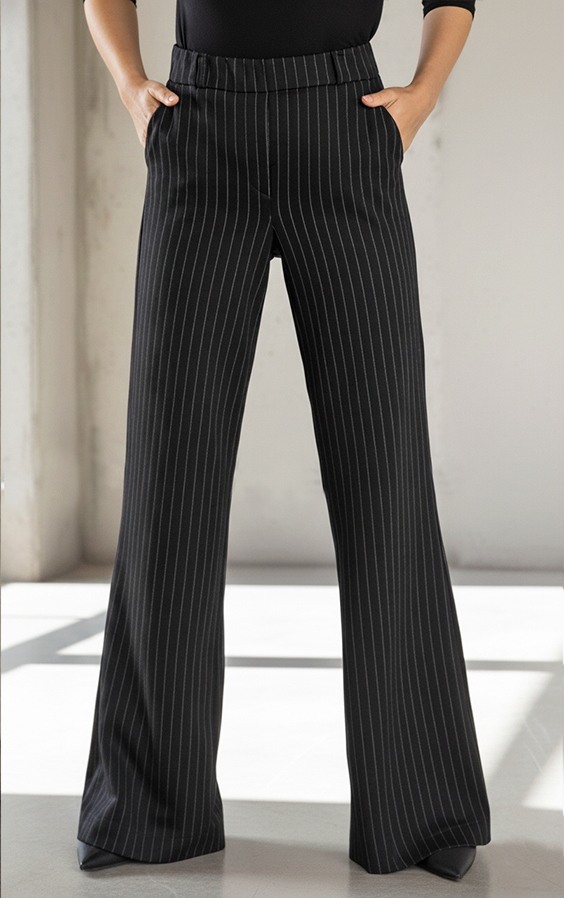 Czarne spodnie damskie w prążek z szeroką nogawką