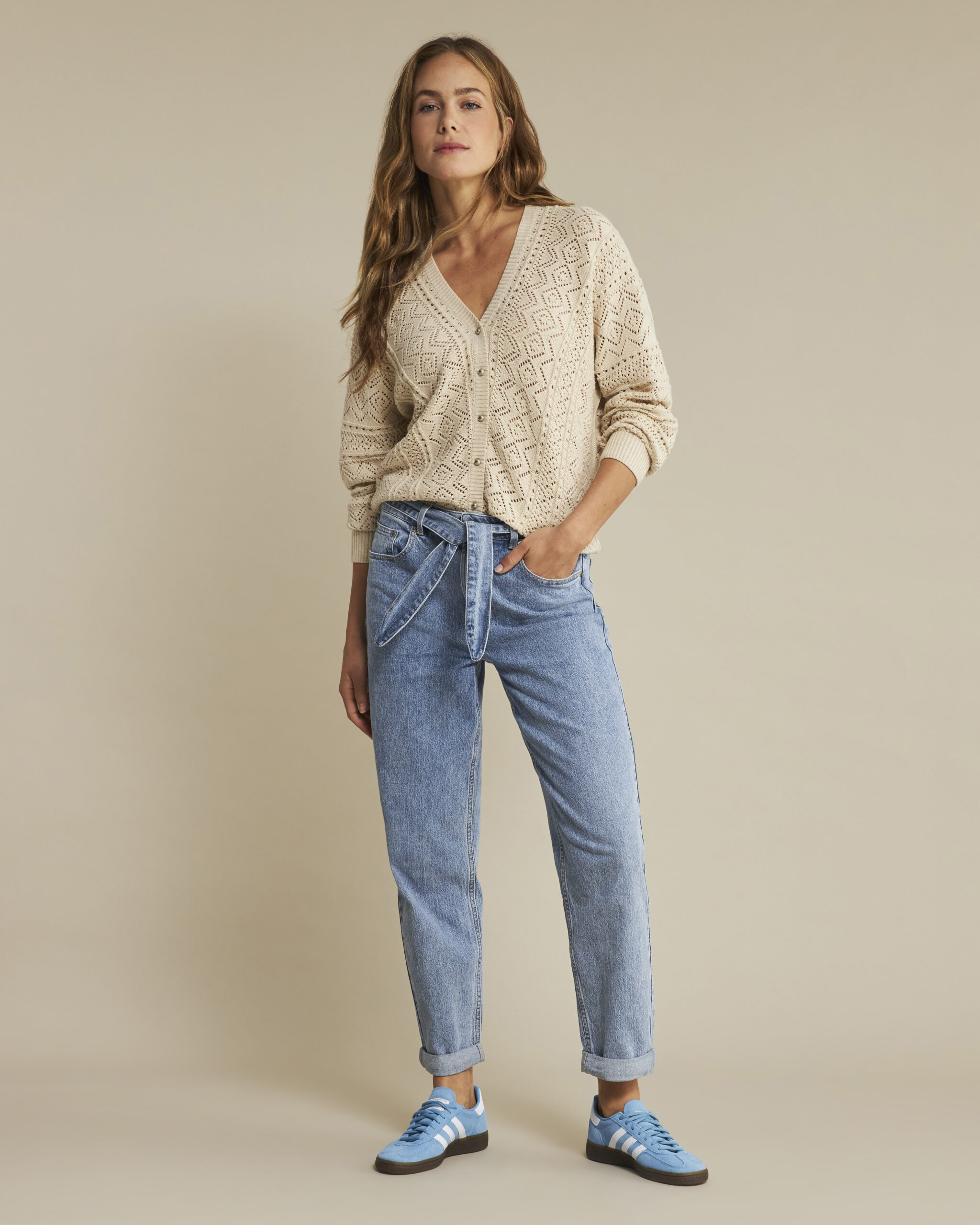 Jasne spodnie z ozdobnym wiązaniem Caitlin bleach bleach SRB4432  typu boyfriend. Szersze w biodrach i nogawkach, a zwężane u dołu co stwarza efekt nonszalanckiego stylu.