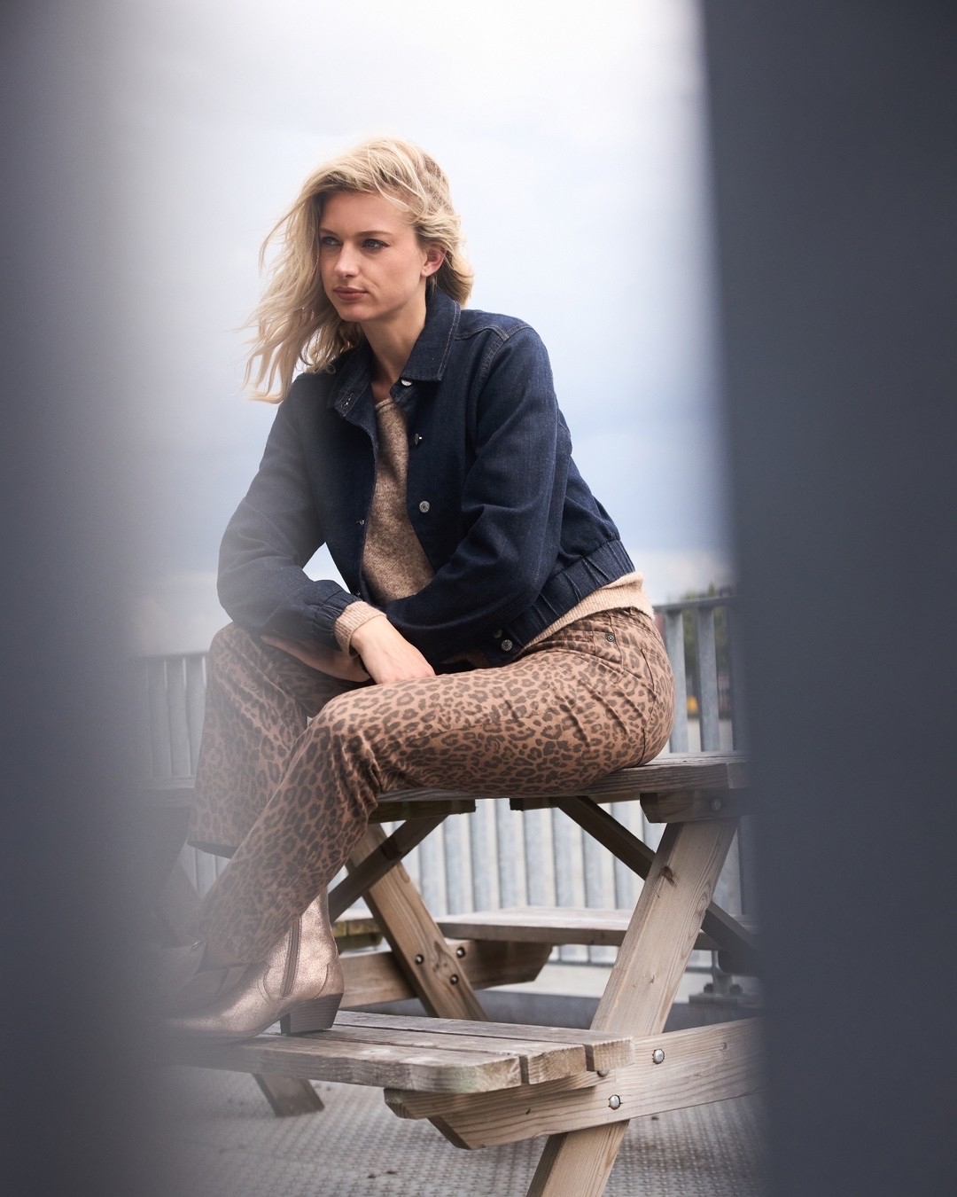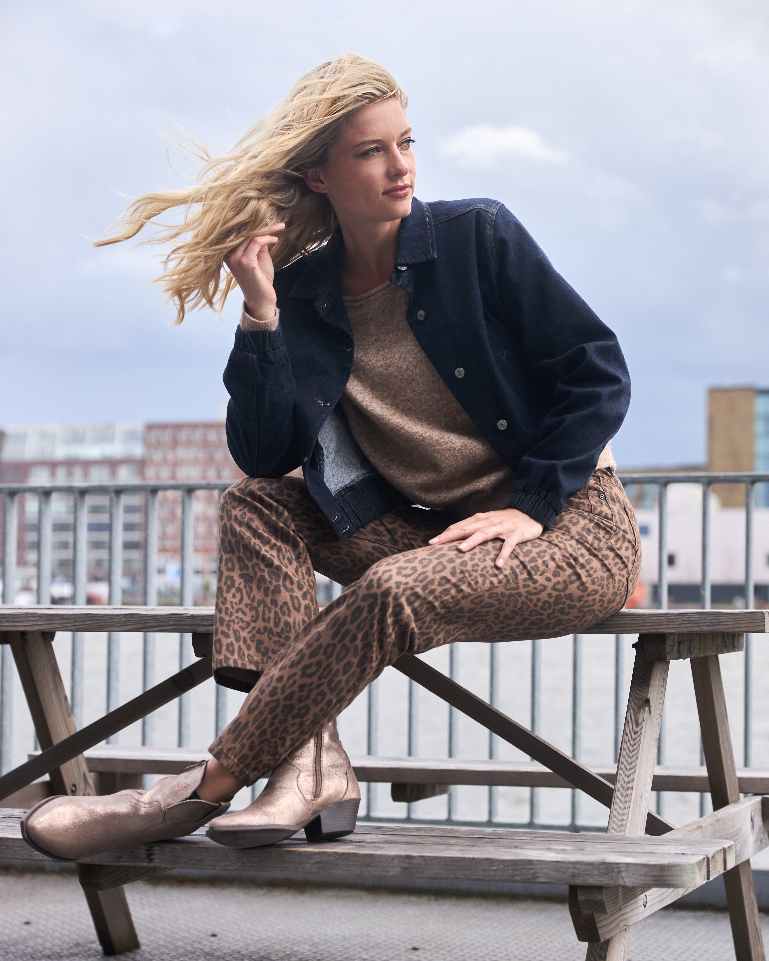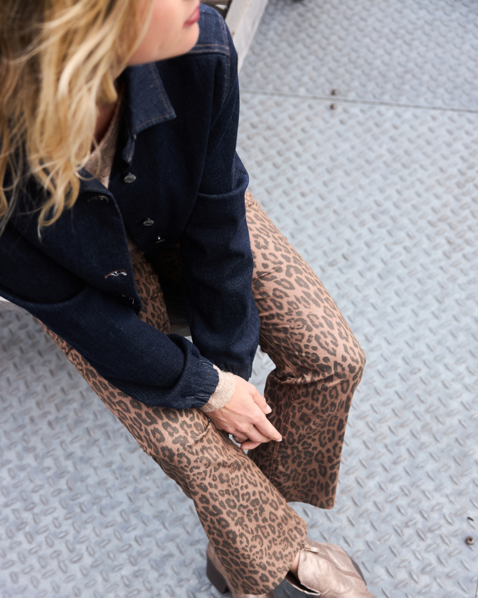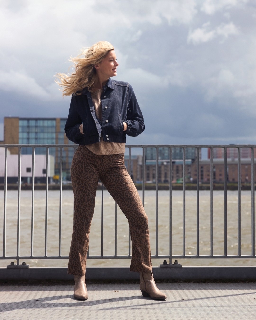 Model Kim Leopard w kolorze Mid Brown wyróżnia się subtelnym wzorem w panterkę, wysokim stanem, regularnym krojem i prostą nogawką o długości 76 cm (30 cali). Miękki, elastyczny denim zachowuje swój kształt, zapewniając jednocześnie wygodę na co dzień.