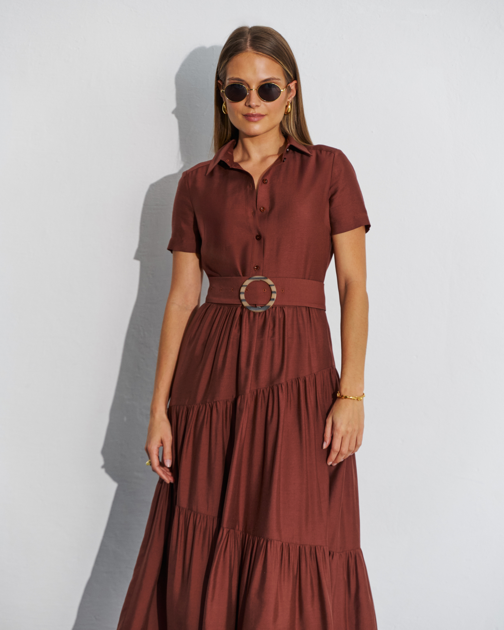 Falbany dodają lekkości, a przy ruchu sukienka prezentuje się jeszcze lepiej. Brązowy kolor wygląda stylowo, spokojnie i bardzo dobrze łączy się z beżem, czernią, złotem czy