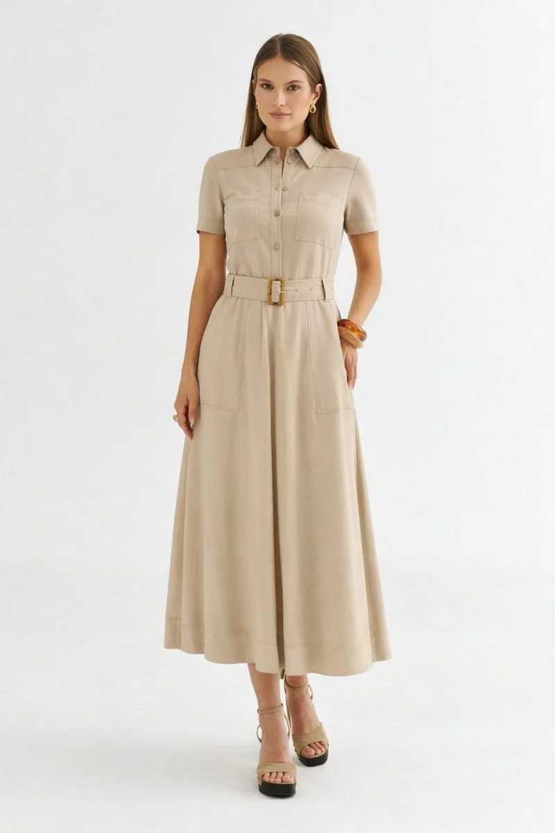 Elegancka sukienka koszulowa w stylu city safari to propozycja dla kobiet, które cenią połączenie wygody, funkcjonalności i ponadczasowego stylu. Piaskowy odcień nadaje jej lekkości i naturalnego charakteru, dzięki czemu świetnie wpisuje się w wiosenno-letnie stylizacje.