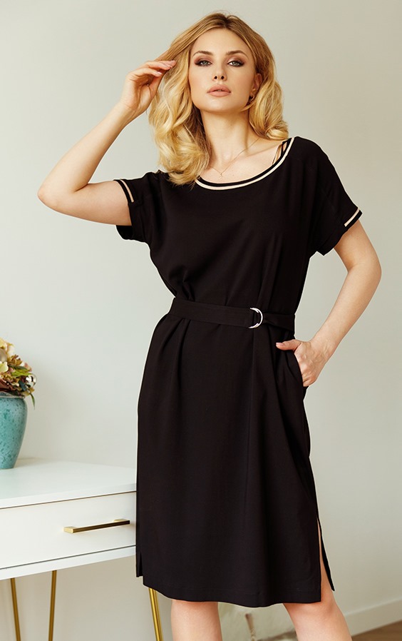 Czarna sukienka, która idealnie sprawdzi się na wiosnę i lato. Sukienka ma delikatnie swobodny fason. Materiał to wiskoza z odrobiną elastanu, dzięki czemu sukienka jest elastyczna i ładnie pracuje. Sukienka Piper posiada okrągły dekolt i krótkie rękawki, które posiadają ozdobne obszycie w postaci ściągacza w sportowym stylu. Bok sukienki ma rozcięcie na wysokości kolan.