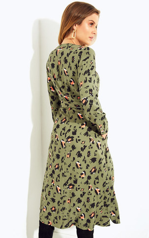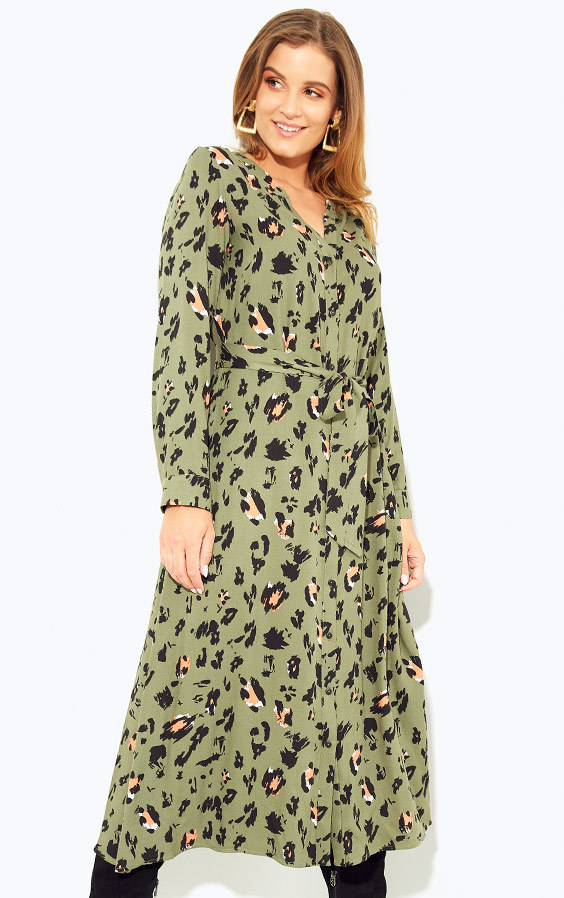 Najmodniejsza tej jesieni długa sukienka koszulowa w panterkowy print. W garderobie spełni podwójną rolę sukienki i koszuli. Zapinana na guziki, dodatkowo można przewiązać ją paskiem. Długie rękawy z mankietami zapinanymi na guziczek, okrągły dekolt z wycięciem w literę V. dwie kieszenie w szwach bocznych. Uszyta z przyjemnej tkaniny wiskozowej.