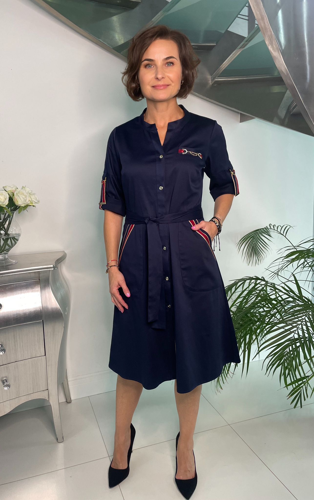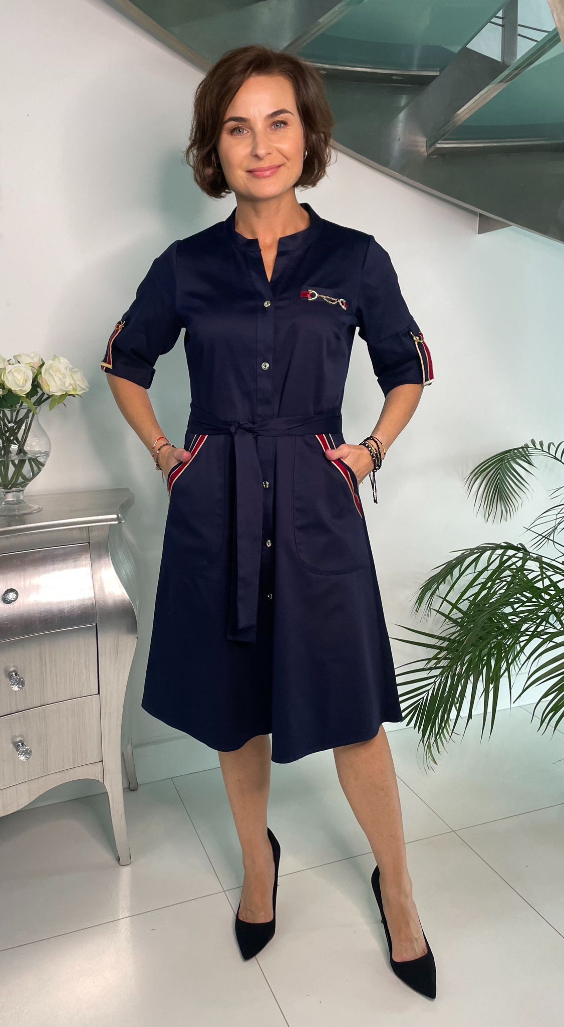 Sukienka uszyta z koszulowej tkaniny, rozpinana na całej długości, odcinana w talii.