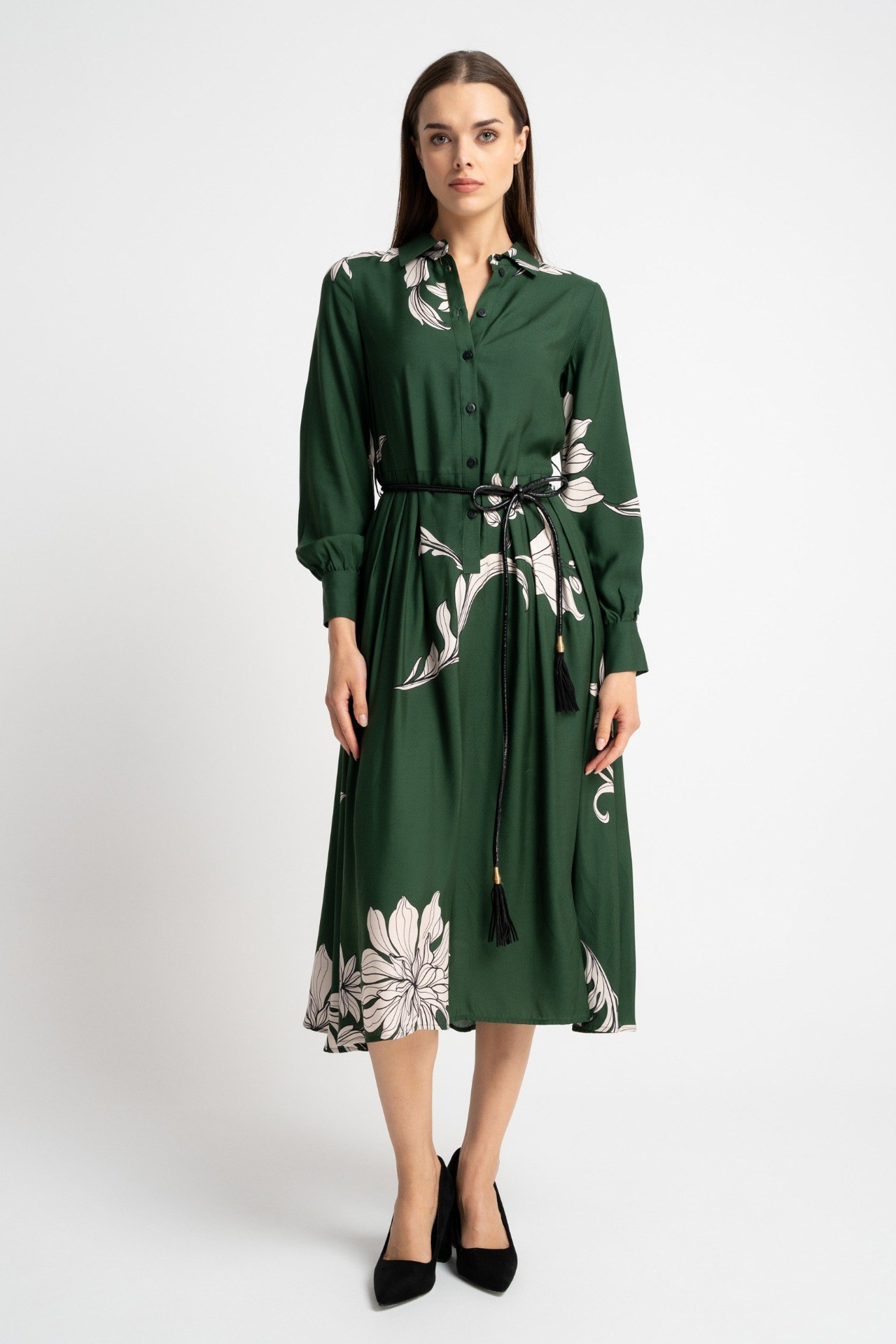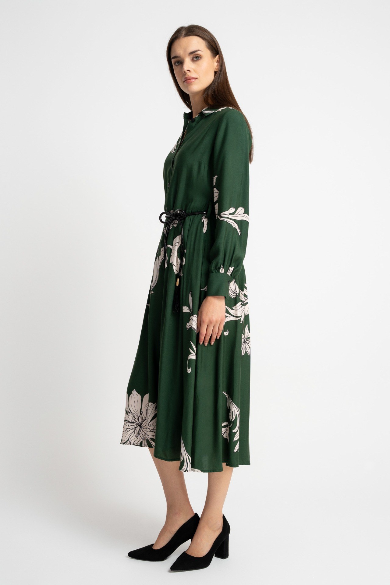 Model o długości midi zachwyca prostym, ponadczasowym krojem z kołnierzykiem i długim, bufiastym rękawem w typie ,,bishop sleeve’’.