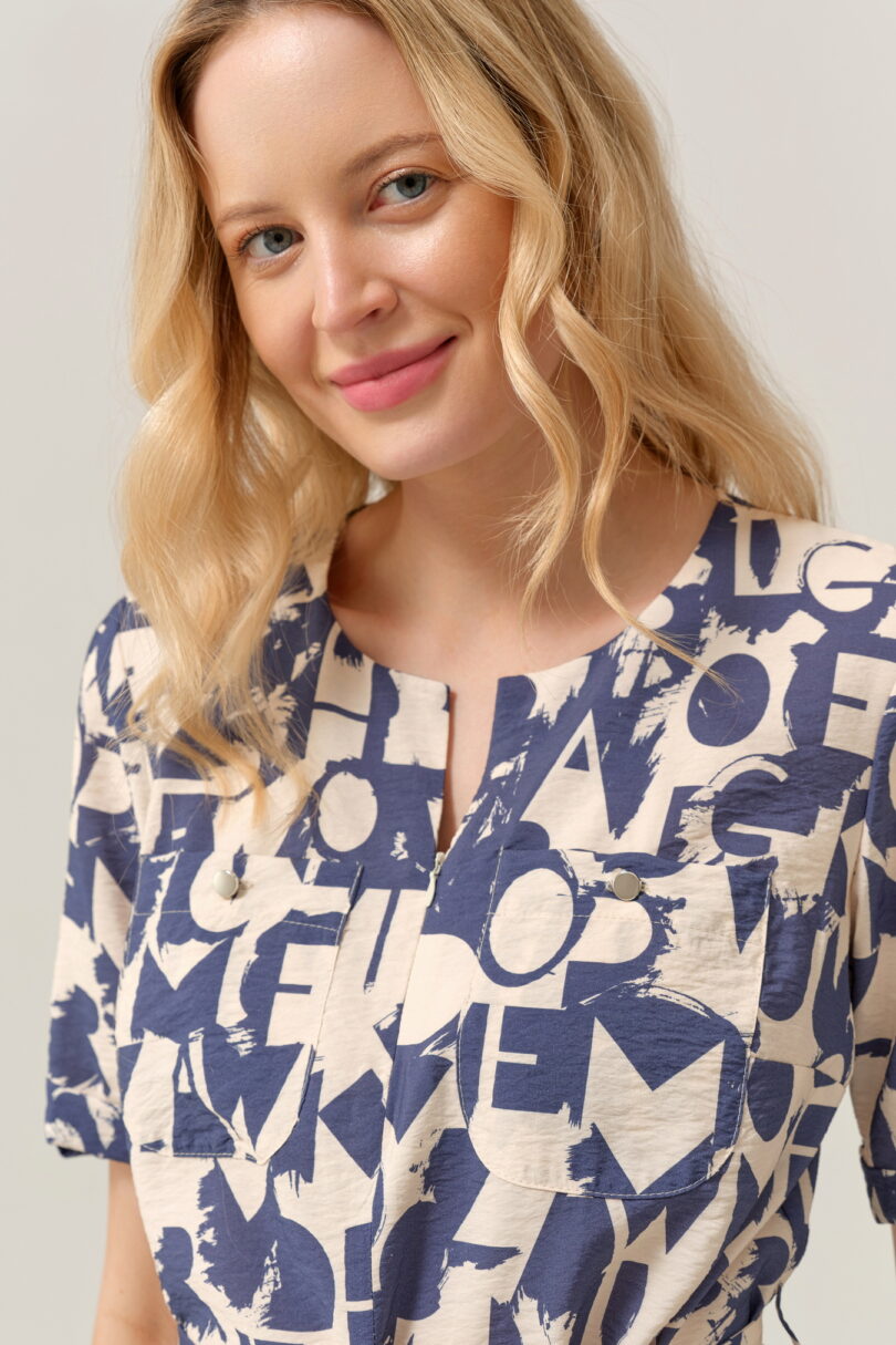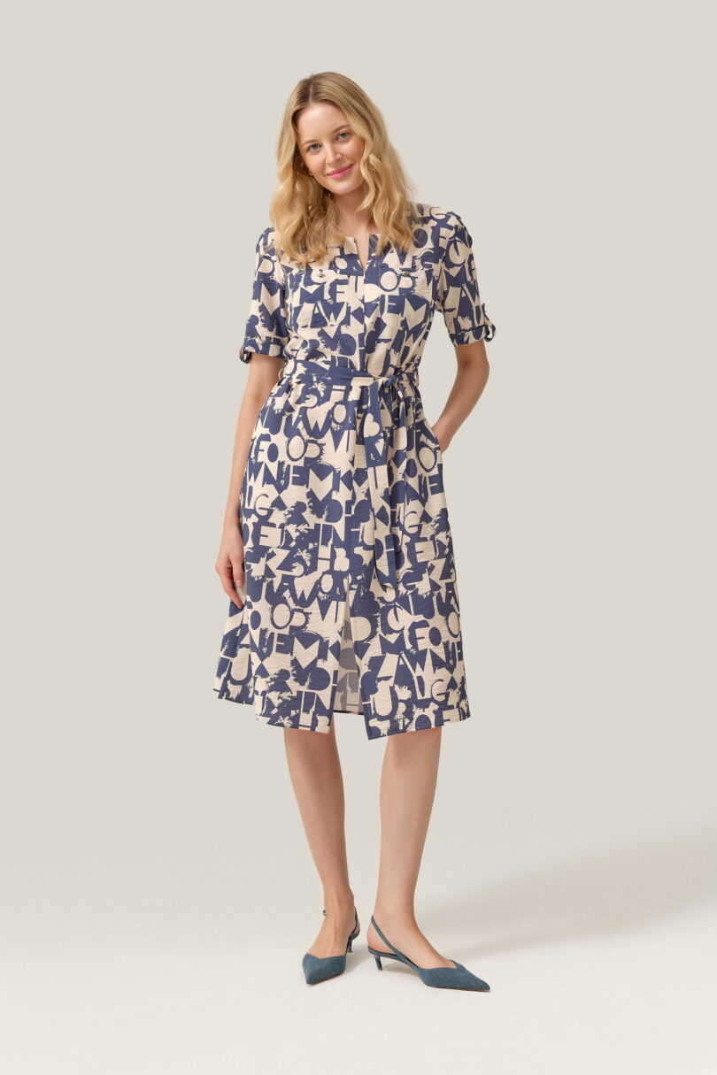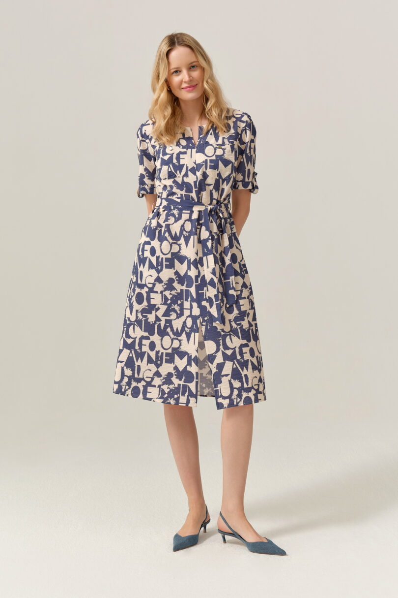 Wyrazista, nowoczesna sukienka o prostym, eleganckim kroju, wykonana z miękkiej, komfortowej tkaniny. Pokryta energetycznym, granatowo-kremowym nadrukiem z motywem liter tworzących dynamiczną, graficzną kompozycję. Dekolt w kształcie subtelnego V wysmukla sylwetkę, a krótkie rękawy zapewniają wygodę i swobodę ruchów. W talii znajduje się delikatne przewiązanie, które pozwala podkreślić figurę i dodać sukience lekkiej asymetrii. Długość midi sprawia, że model jest idealny zarówno na co dzień, jak i do pracy czy na spotkania. Świetnie komponuje się z białymi, granatowymi lub beżowymi dodatkami — od sandałów po lekkie sneakersy.