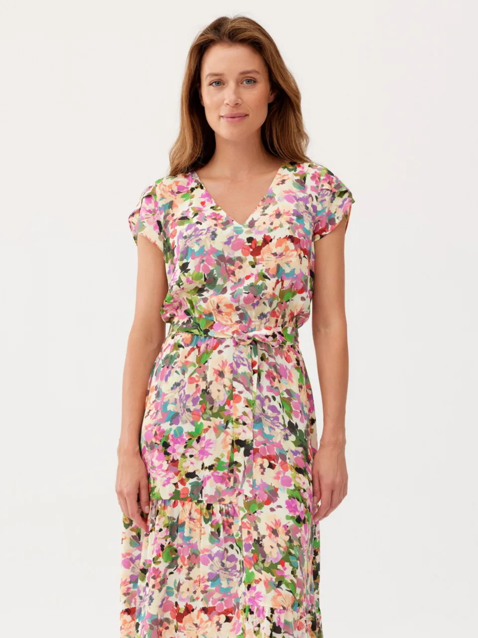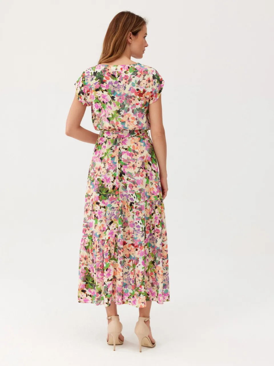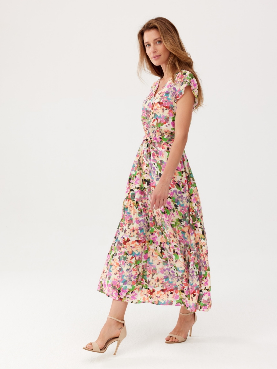 Luźny krój z krótkim rękawkiem i dekoltem w serek zapewnia pełen komfort noszenia, a wiązanie w talii pięknie modeluje sylwetkę. To idealna sukienka na upalne dni – sprawdzi się zarówno podczas spacerów, jak i na letnich przyjęciach.
