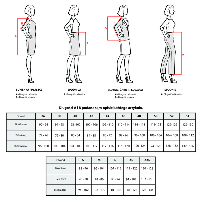Długość całkowita wynosi od 129 cm dla rozmiaru S do 132 cm dla rozmiaru XL.