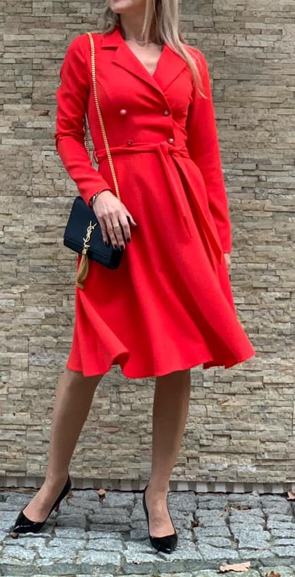 Czerwona rozkloszowana sukienka. Połączenie look’u sportowego z wizytowym daje efekt wyjątkowej kreacji. Żakietowa góra i rozkloszowany dół tworzą idealne połączenie. Długi zwężany rękaw i tekstylny pasek dopełniają całości. Dla wygody wkładania sukienka ma z boku wszyty zamek. Długość w kolano. Uszyta z mięsistej ( nie wiotkiej) tkaniny typu punto.