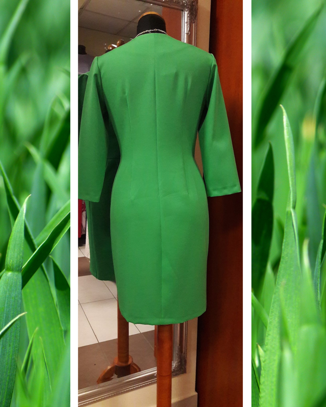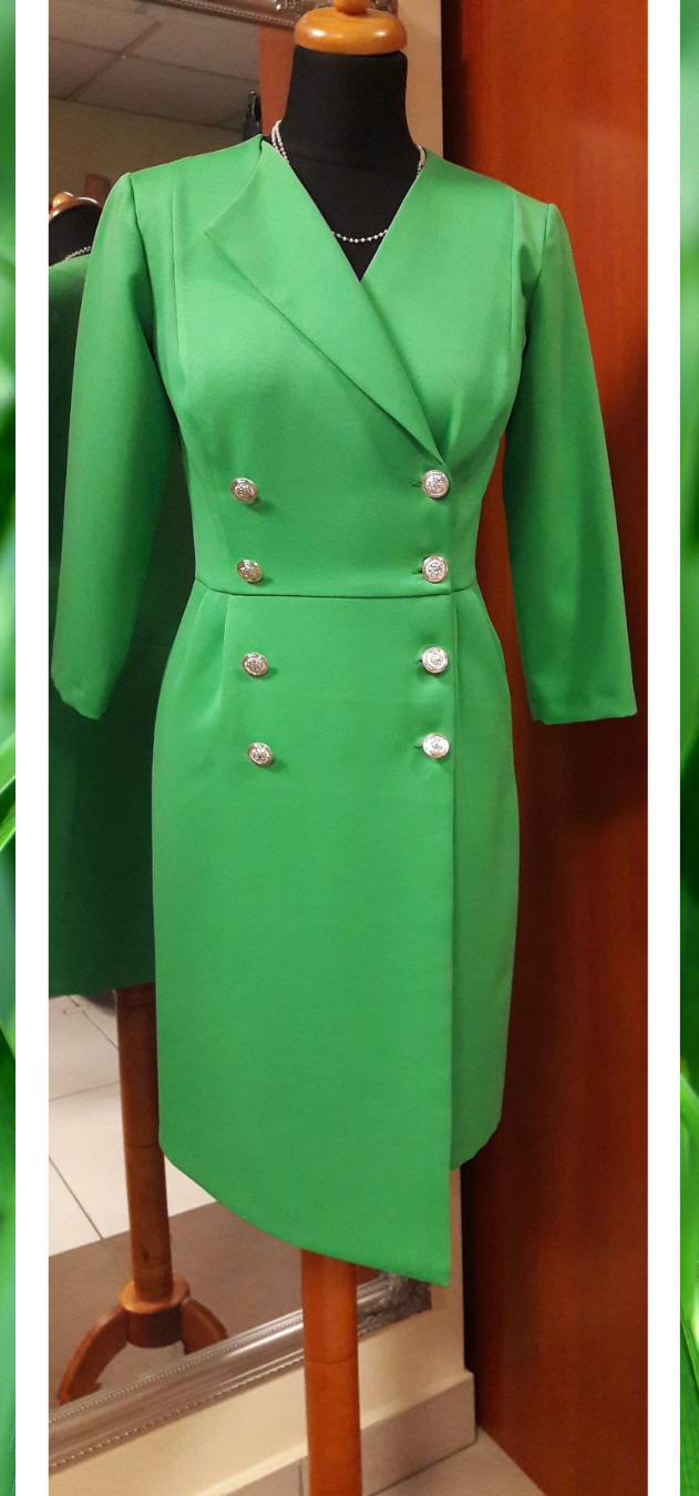 Elegancka sukienka z dekoltem V i asymetrycznym wykładem (z jednej strony) i rękawami do łokcia. Sukienka odcinana w tali, z tyły dopasowana zaszewkami, zapinana na expres. Z przodu lekkie zakładeczki od talii w dół, zapinana na eleganckie złote guziki. Spódnica zakładana, asymetrycznie wydłużona z jednego boku na przodzie.