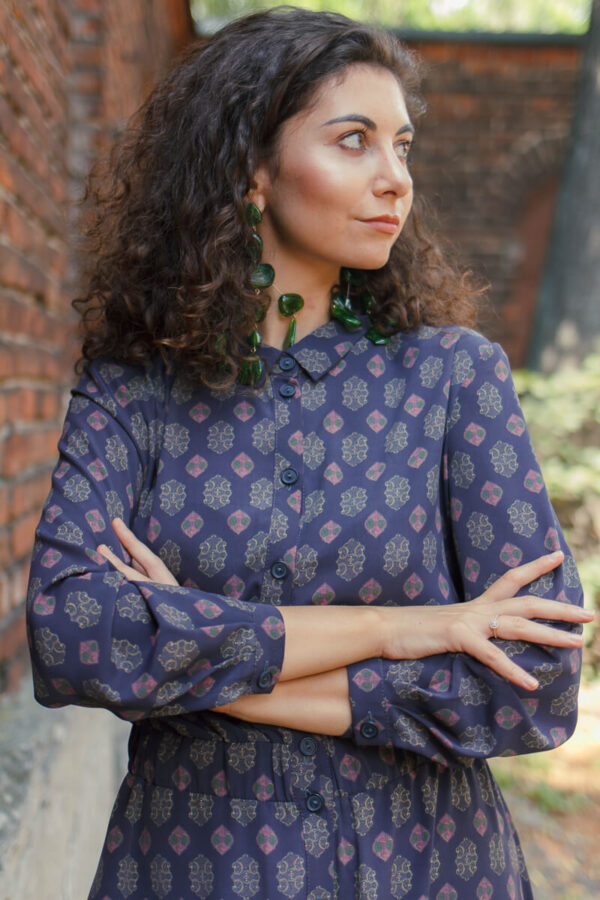 Rozpinana szmizjerka midi z kołnierzykiem z firmy Far Far. Szeroka guma w talii pięknie modeluje sylwetkę. Koszulowy charakter szmizjerki pozwala bawić się stylizacjami, można nosić ją jako sukienkę lub okrycie wierzchnie