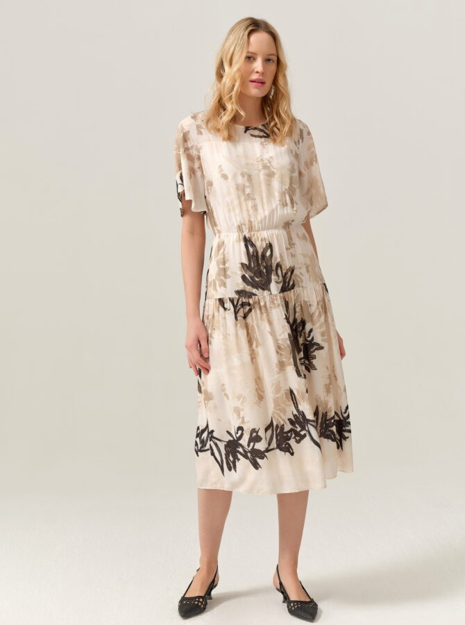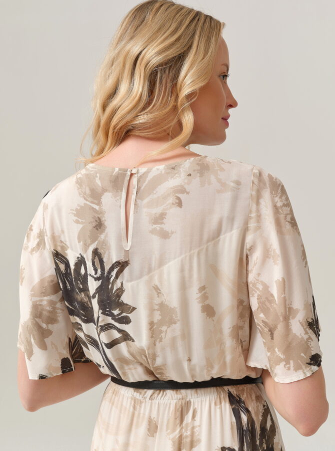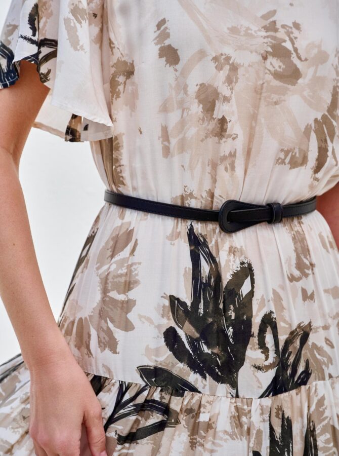 Elegancka, lekka sukienka o luźniejszym kroju, która pięknie miękko opływa sylwetkę. Delikatny, artystyczny print w odcieniach beżu i czerni nadaje jej subtelnej, nowoczesnej elegancji. Model ma krótkie, szerokie rękawy i elastyczną talię podkreśloną materiałowym paskiem, dzięki czemu figura zyskuje lekko zaznaczony kształt przy pełnym komforcie noszenia. Długość maxi i lekko rozkloszowany dół tworzą efekt zwiewności przy każdym ruchu. To idealna sukienka na lato, specjalne okazje, ale też na co dzień — wystarczy zmienić dodatki, aby dopasować ją do stylu.