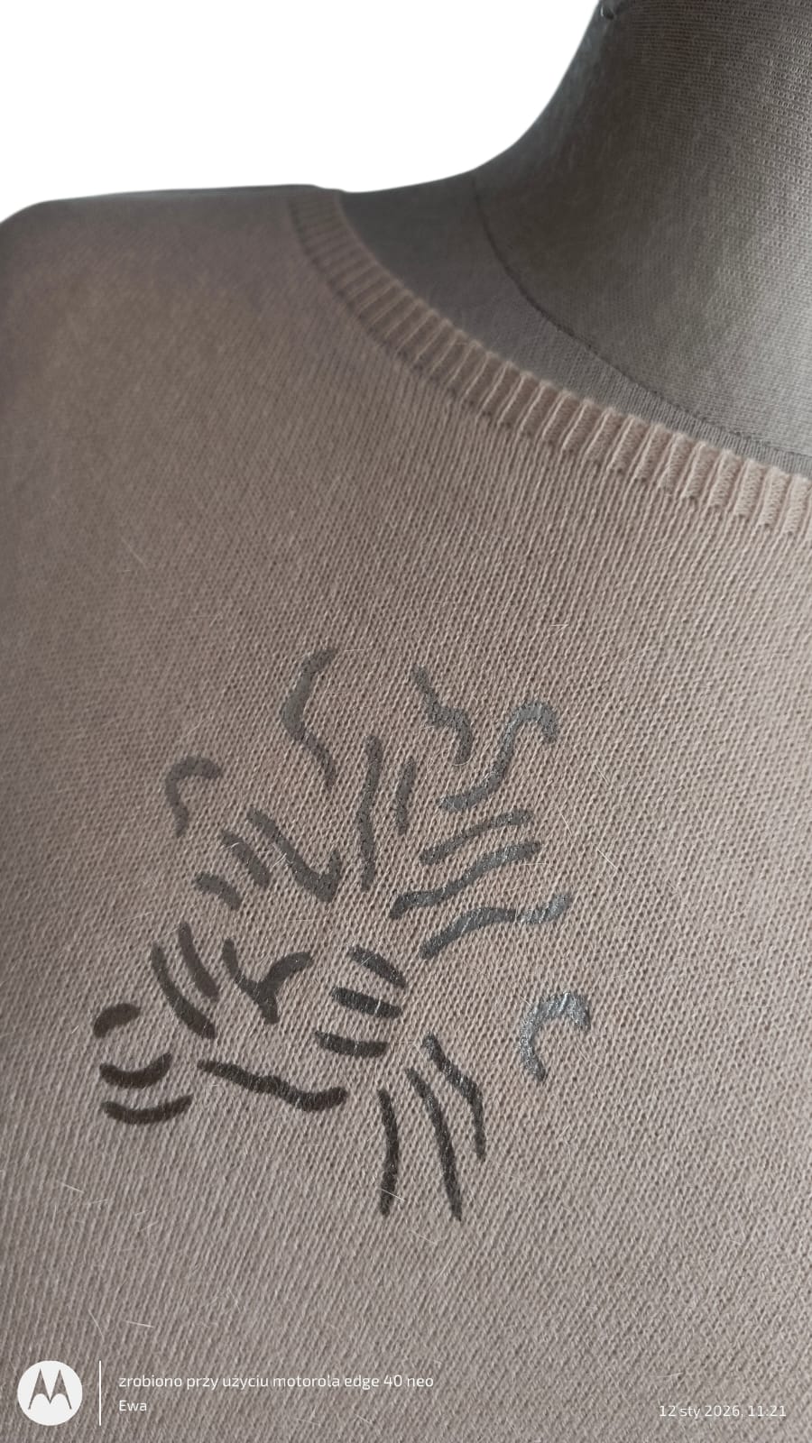 Bluzka dekoltem w łódką i pięknym srebrnym nadrukiem kwiatowym.