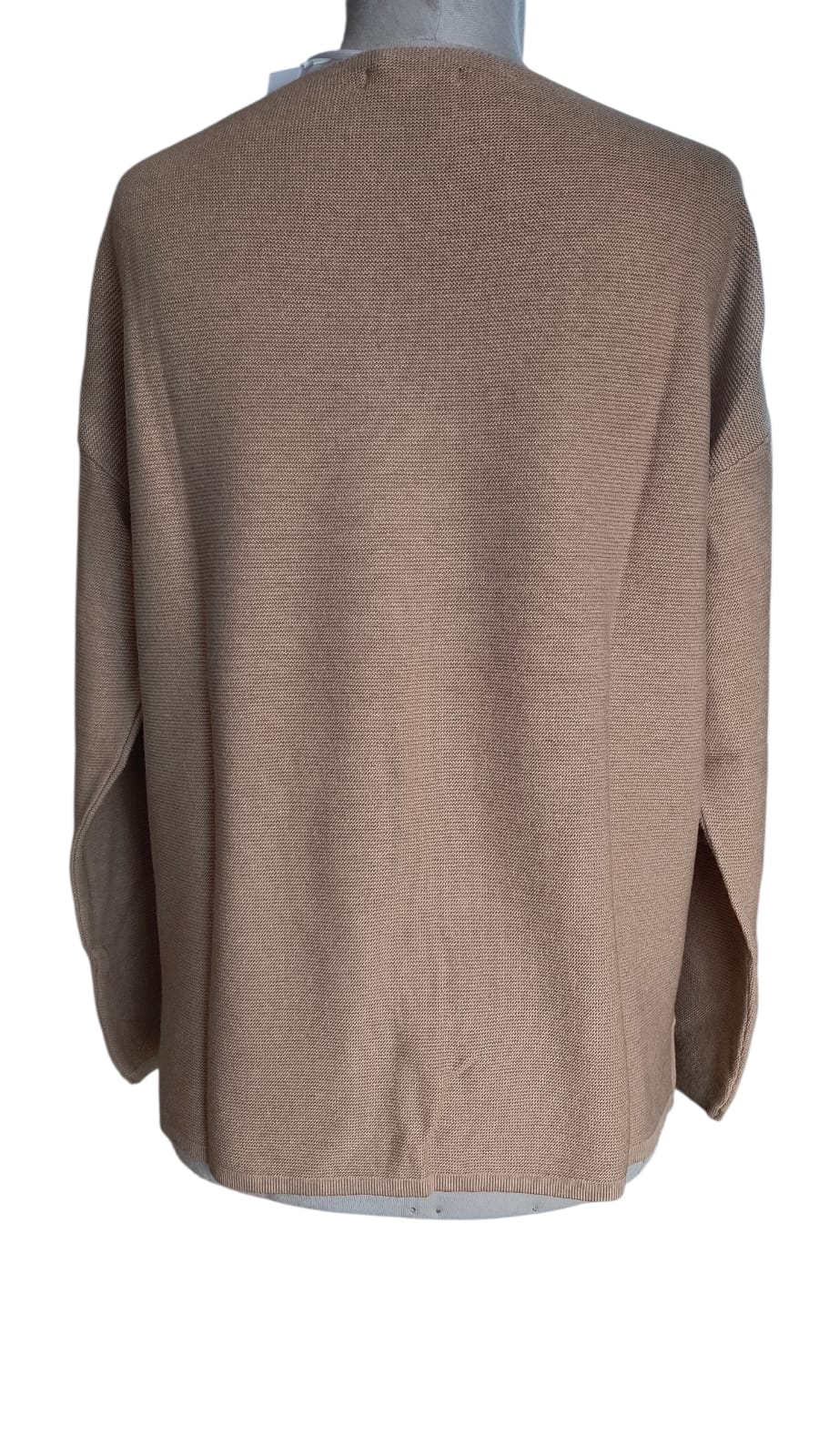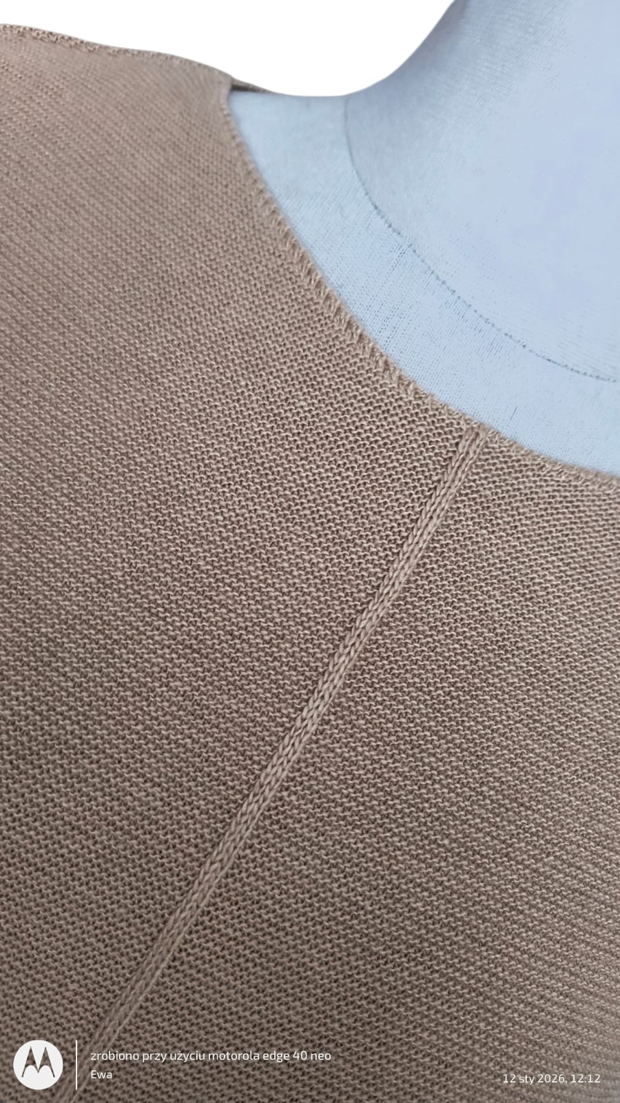 Wygodna bluzka sweterkowa z dodatkiem kaszmiru i wełny w kolorze camelowym. Wykonana ściegiem o delikatnej strukturze z wysmuklająca ozdobną linią, biegnącą przez środek przodu, idealna do pracy i na spotkanie. Wyprodukowana w Polsce.