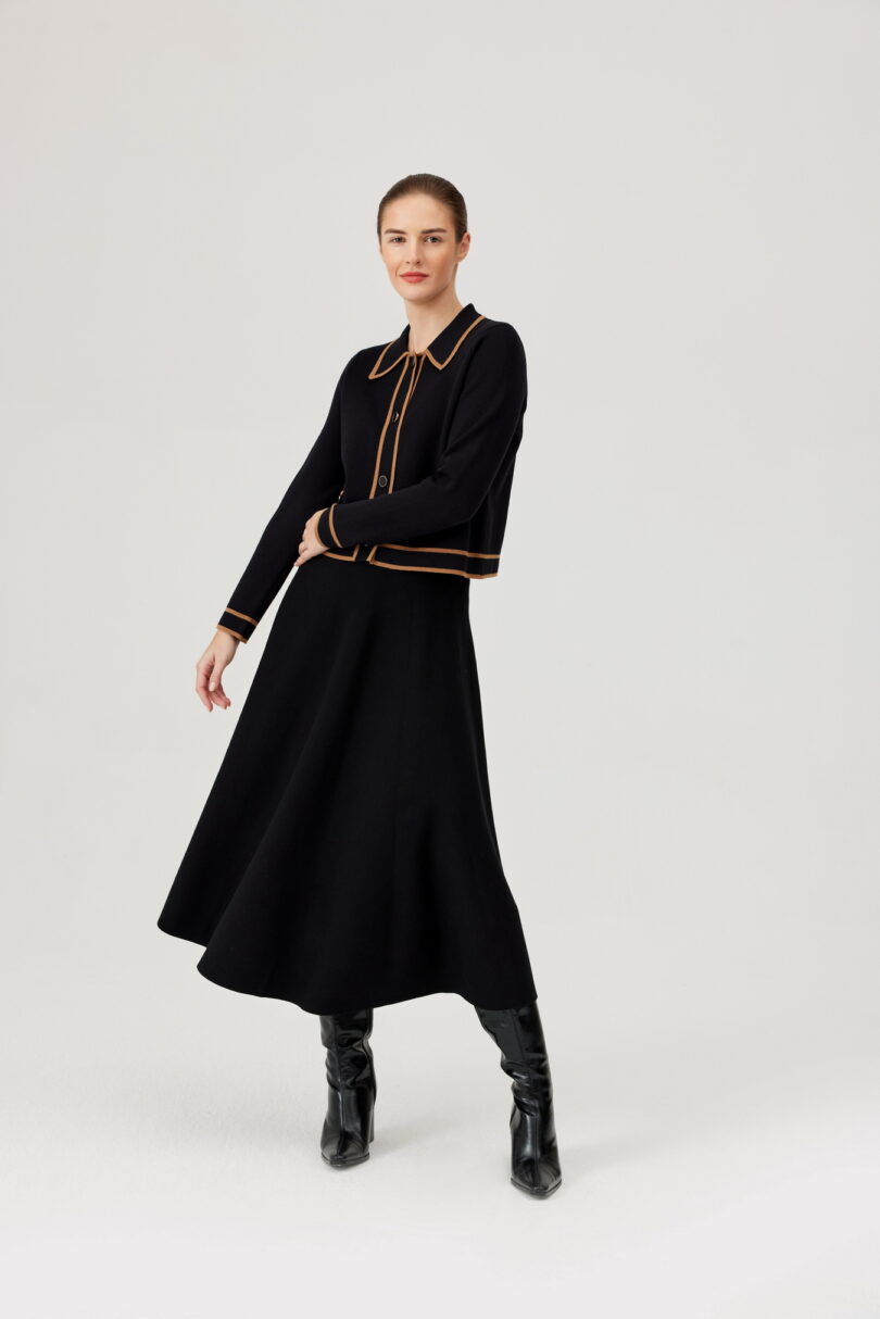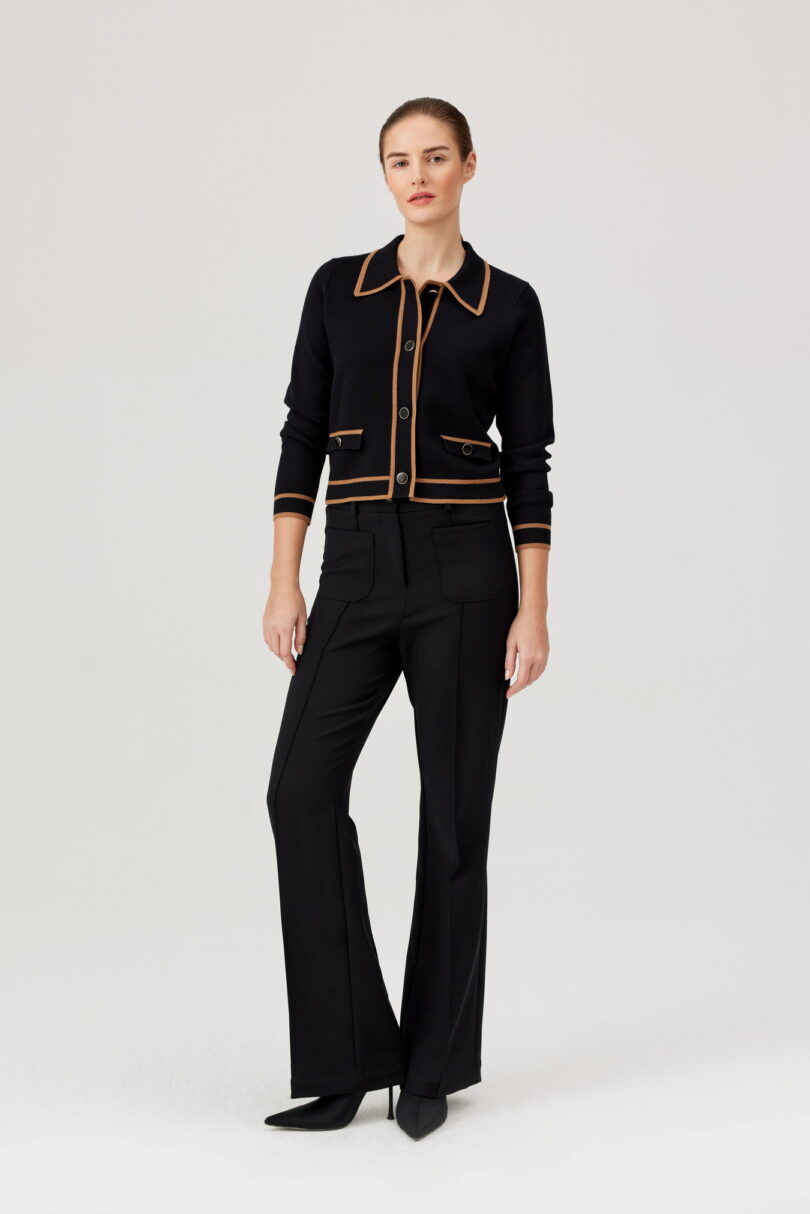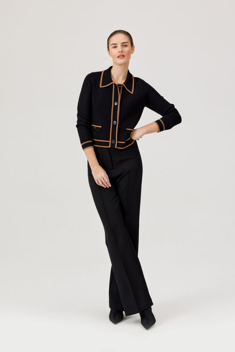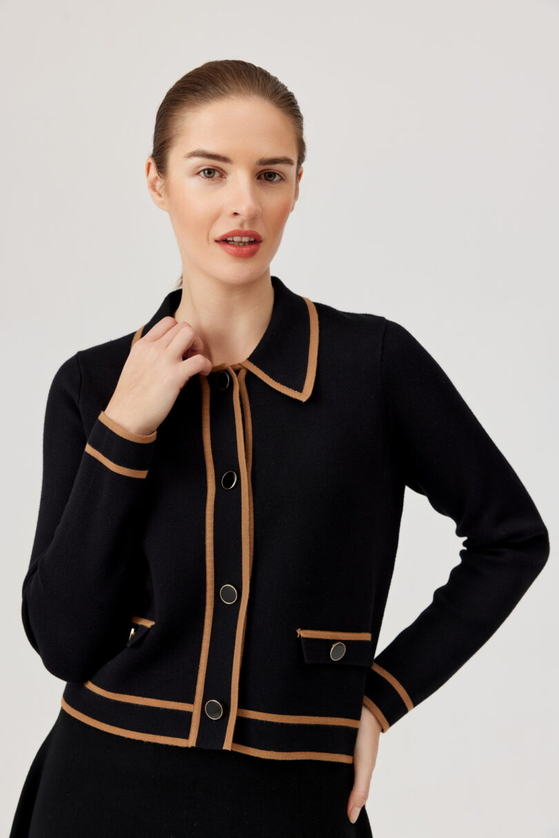 Żakiet FÉRIA z kontrastową lamówką. Stylowy, dzianinowy żakiet w czerni, wykończony efektowną, karmelową lamówką. Model zapinany na ozdobne guziki z nadającymi charakteru patkami. Klasyczny kołnierzyk dodaje elegancji, a miękka wiskozowa dzianina zapewnia wygodę noszenia. Idealny do stylizacji biurowych, jak i casualowych – świetnie prezentuje się zarówno ze spodniami, jak i spódnicą.