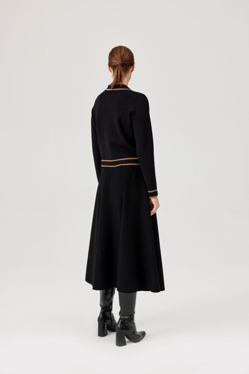 Żakiet FÉRIA z kontrastową lamówką. Stylowy, dzianinowy żakiet w czerni, wykończony efektowną, karmelową lamówką.