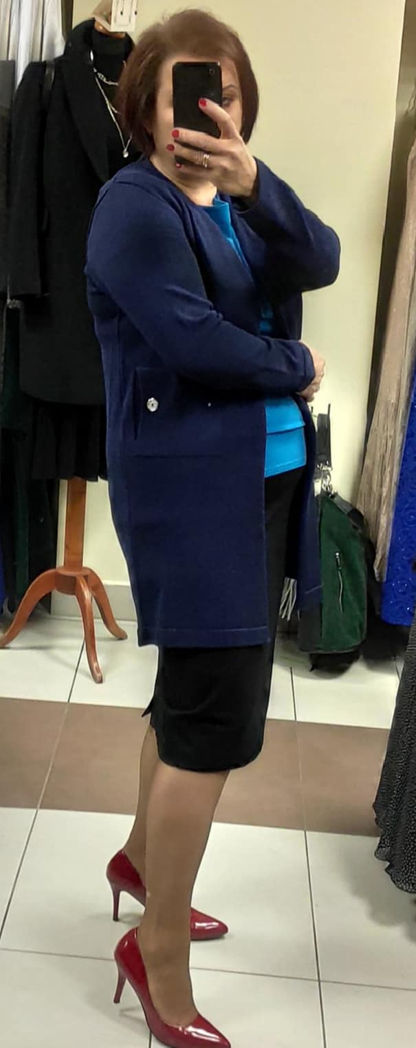 Dzianinowy płaszcz marki AL-BO z kieszeniami, ozdobionymi srebrnymi guzikami. Wzdłuż całych pleców ozdobny pas, robiony odwrotnym ściegiem, który wysmukla sylwetkę. Płaszcz bez zapięcia, ale można go spiąć ozdobną broszą.