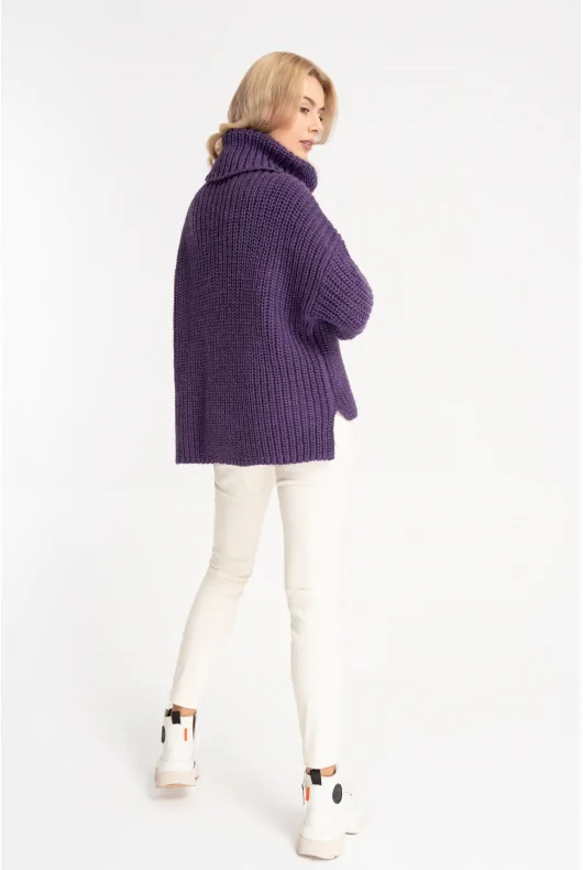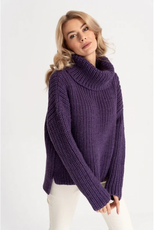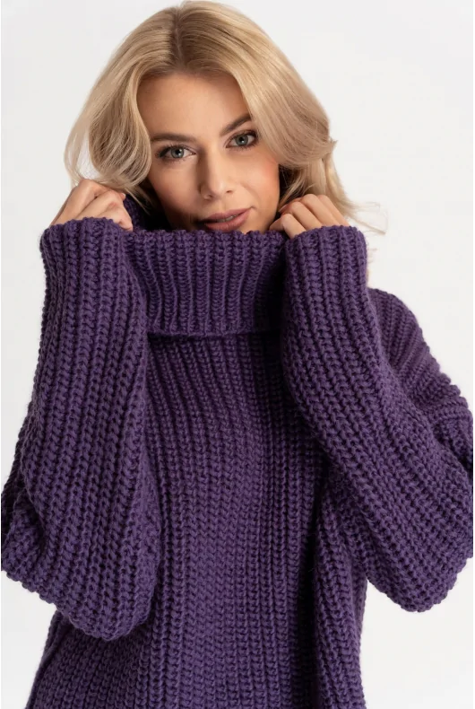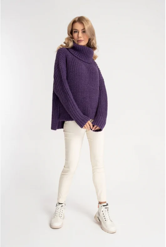 Luźny, oversizowy golf w długości do bioder, w kolorze fioletowym. Uszyty z grubej dzianiny z dodatkiem wełny o gęstym splocie. Obniżona linia ramion, długie proste rękawy. Dłuższy tył z rozcięciami na bokach. Szeroki, wywijany golf doskonale ochroni przed jesiennym chłodem.