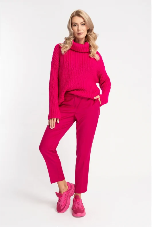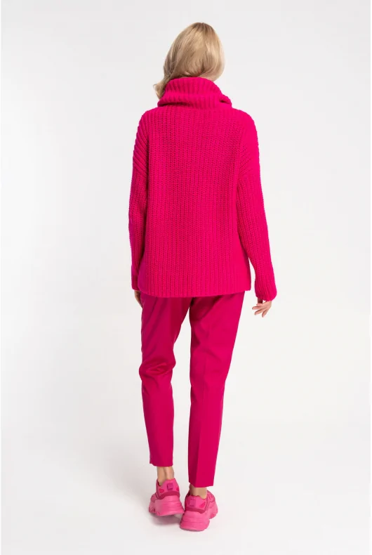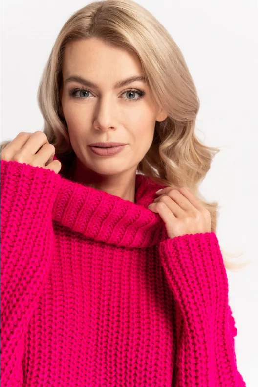 Luźny, oversizowy golf w długości do bioder, w kolorze różowym. Uszyty z grubej dzianiny z dodatkiem wełny o gęstym splocie. Obniżona linia ramion, długie proste rękawy. Dłuższy tył z rozcięciami na bokach. Szeroki, wywijany golf doskonale ochroni przed jesiennym chłodem.