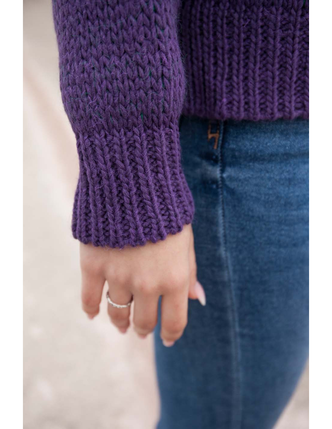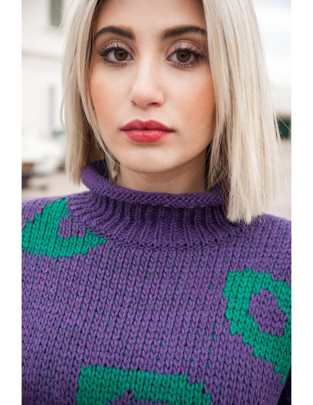 Oryginalny sweter z żakardowym wzorem. Pod szyją wykończony wywijaną, małą a’la stójką.