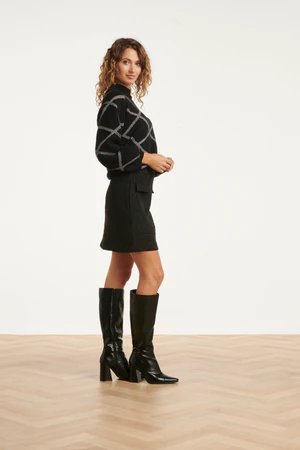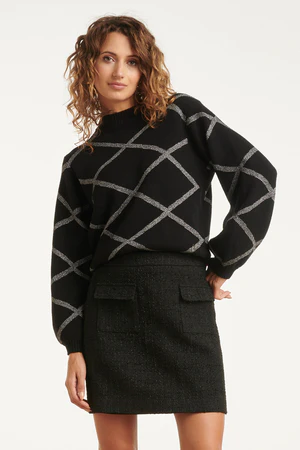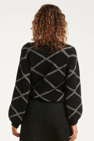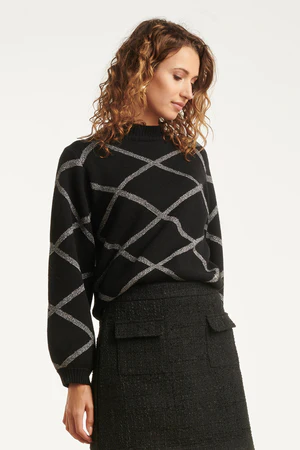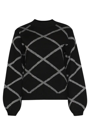 Dzianinowy sweter z graficznym srebrnym wzorem w kratkę, który tworzy stylowy, nowoczesny look.