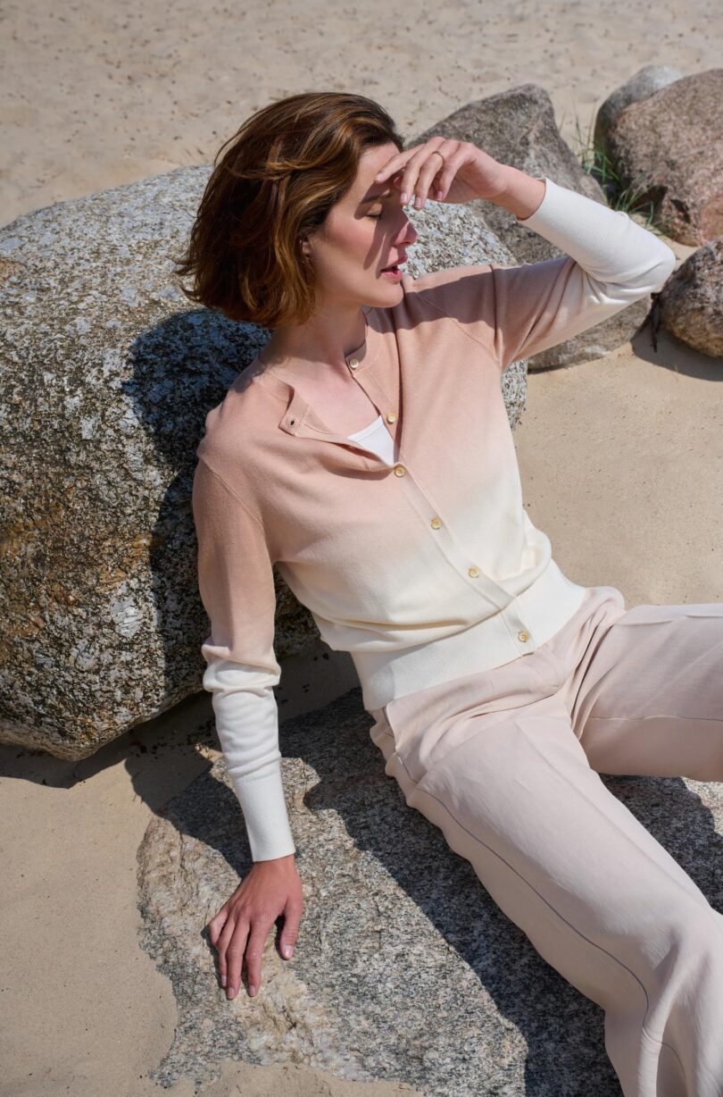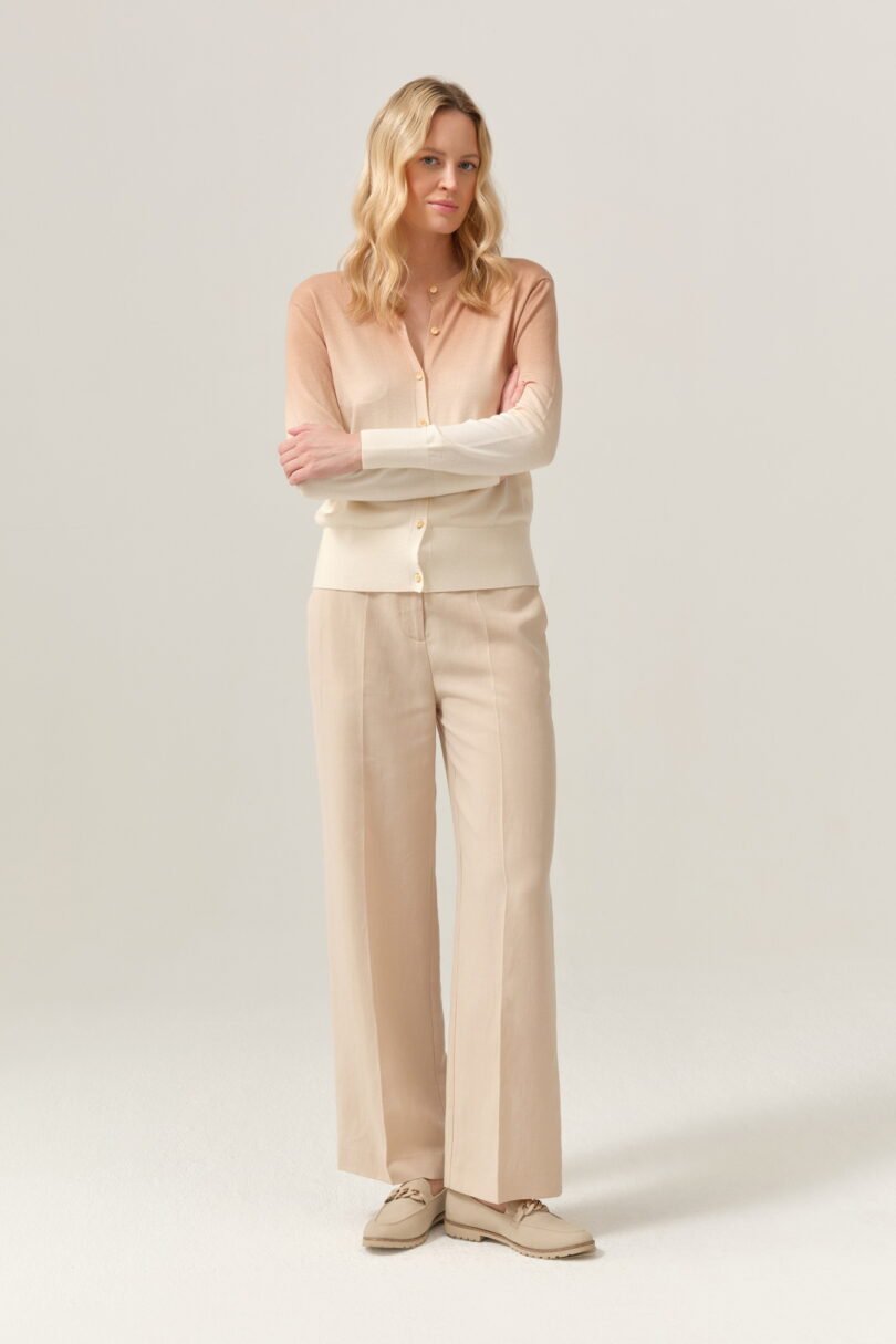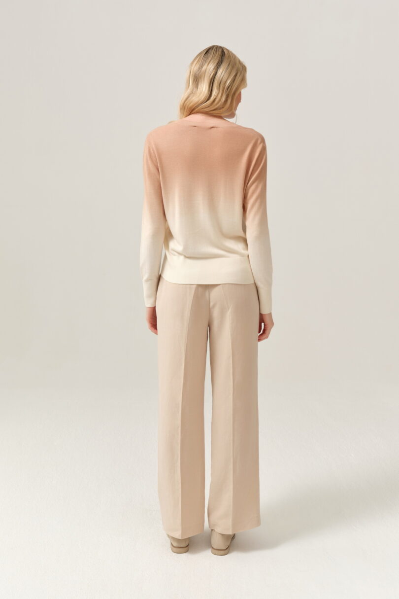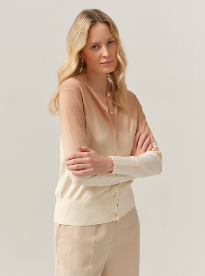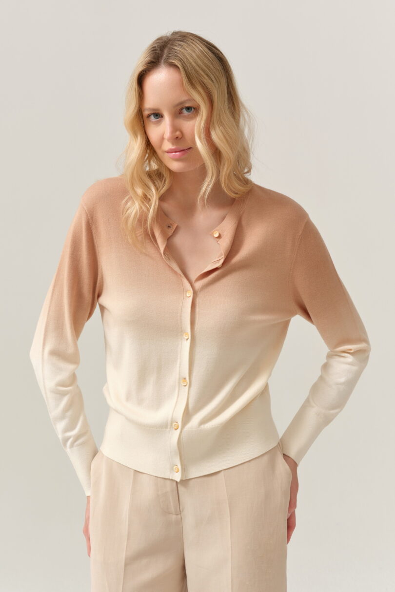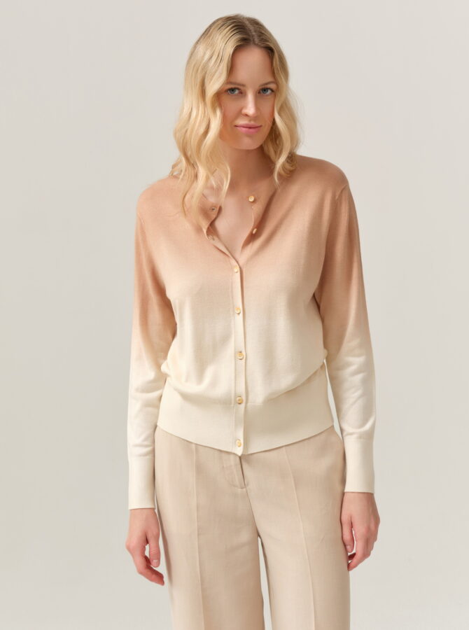 Lekki sweter o klasycznym, prostym kroju, wyróżniający się subtelnym przejściem kolorystycznym typu ombre – od beżu u góry po jasny, kremowy odcień u dołu. Delikatna dzianina miękko układa się na sylwetce, zapewniając komfort noszenia. Model zapinany na drobne guziki, z okrągłym dekoltem i długimi rękawami, sprawdzi się zarówno noszony samodzielnie, jak i jako kardigan narzucony na top lub sukienkę. Idealny do codziennych, spokojnych stylizacji w stylu casual i soft elegance.