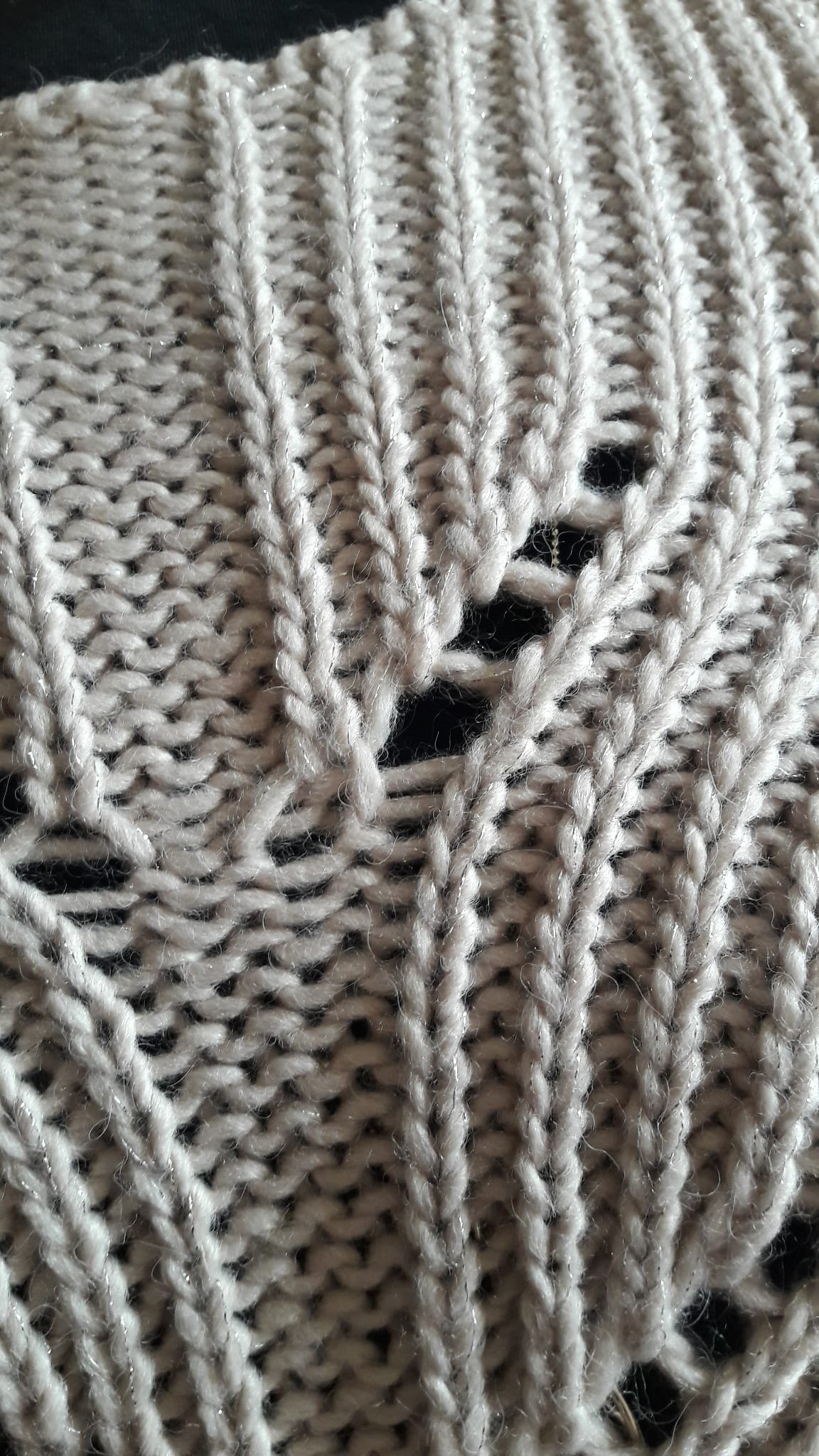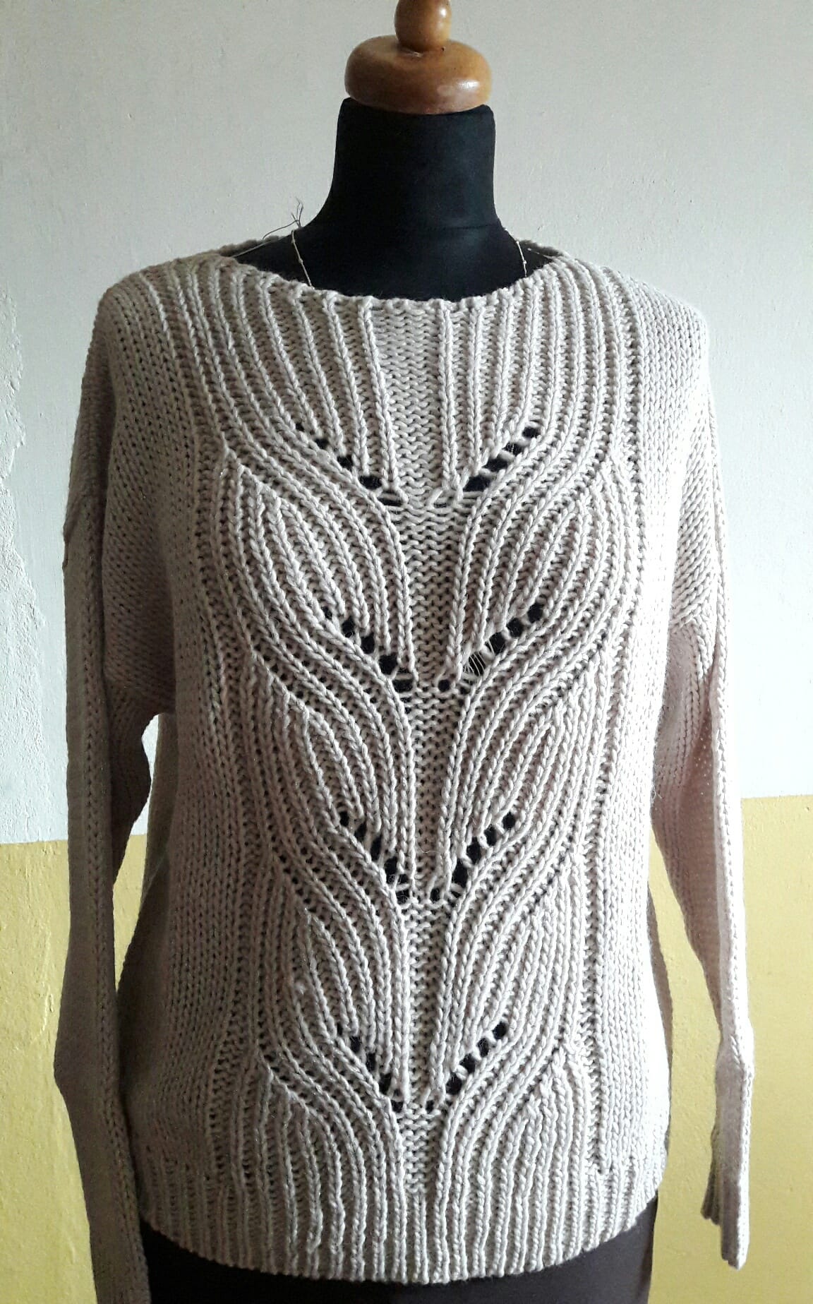 Sweter z dodatkiem wełny, z dekoltem w łódkę. Dół i rękawy zakończone ściągaczem. Z przodu ażurowy wzór warkocza, z tyłu gładki. Wpleciona bardzo subtelna połyskująca nitka. Bardzo miły i ciepły sweter. Idealny do wielu stylizacji.
