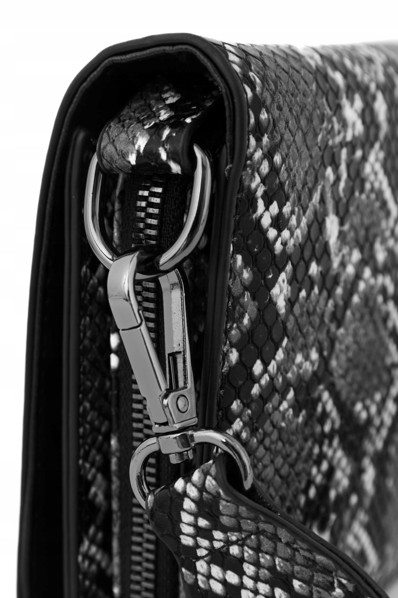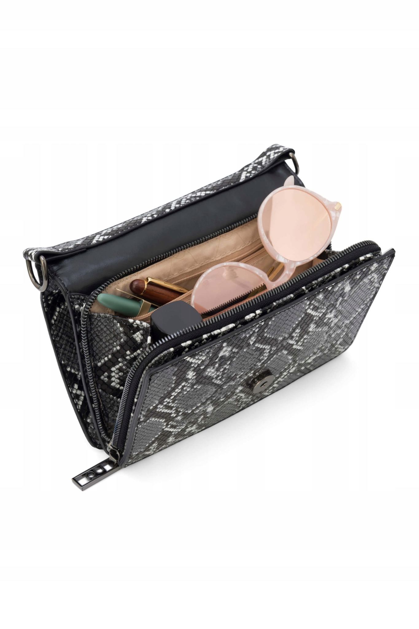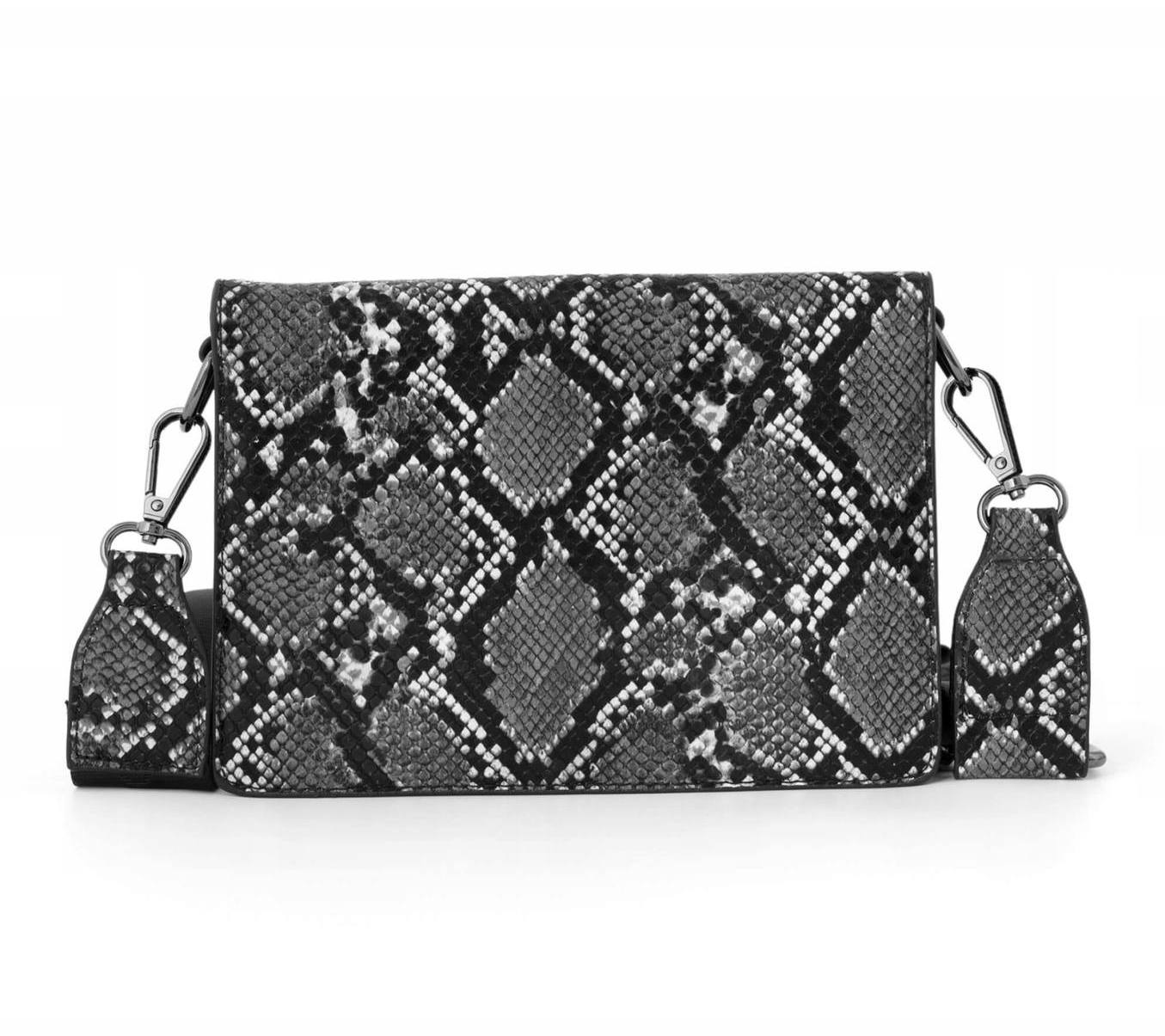 Klasyczny fason o sztywnej konstrukcji, najmodniejszy motyw zwierzęcy oraz parciany pasek to tylko część charakterystycznych elementów tego modelu. Torebka posiada klapkę zapinaną na magnes, zaś w środku 2 płaskie kieszenie oraz główna komora w formie piórnika zamykana na suwak. Mimo niewielkich rozmiarów bez problemu zmieścisz w niej telefon, klucze, karty oraz ulubioną szminkę. Szeroki, regulowany pasek w kolorze czarnym sprawi, że będziesz mogła nosić listonoszkę, wygodnie przez ramię albo jak typową kopertówkę, przy odpięciu paska. Model ten jest uniwersalny i będzie świetnie prezentować się zarówno z codziennymi stylizacjami jak i na wieczorne wyjścia do miasta.